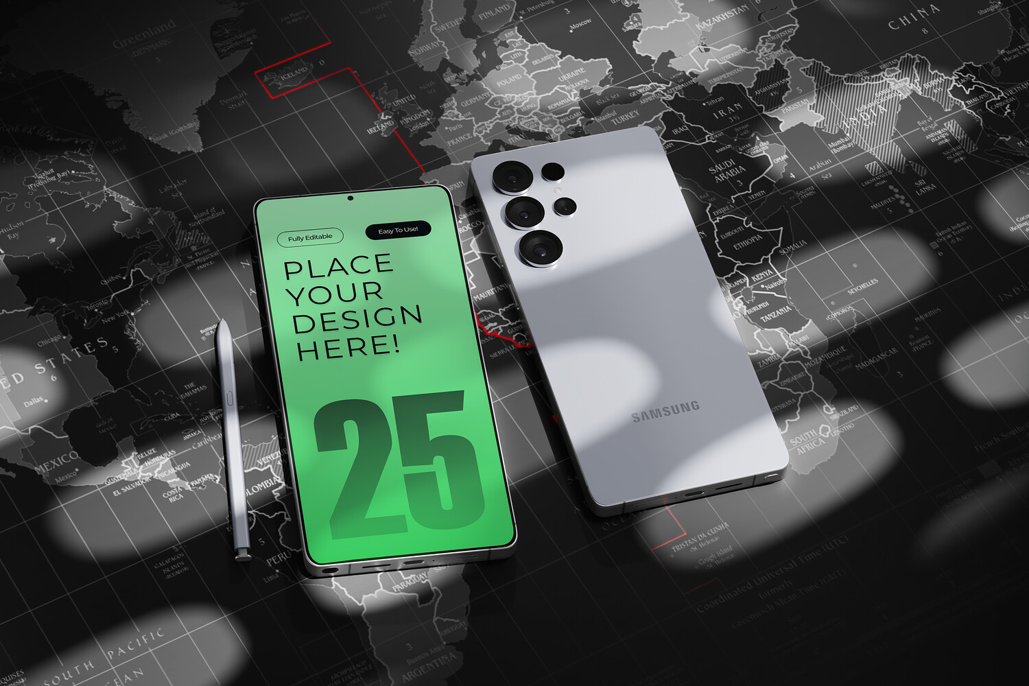 Samsung Galaxy S24 Ultra Mockup PSD Template on World Map