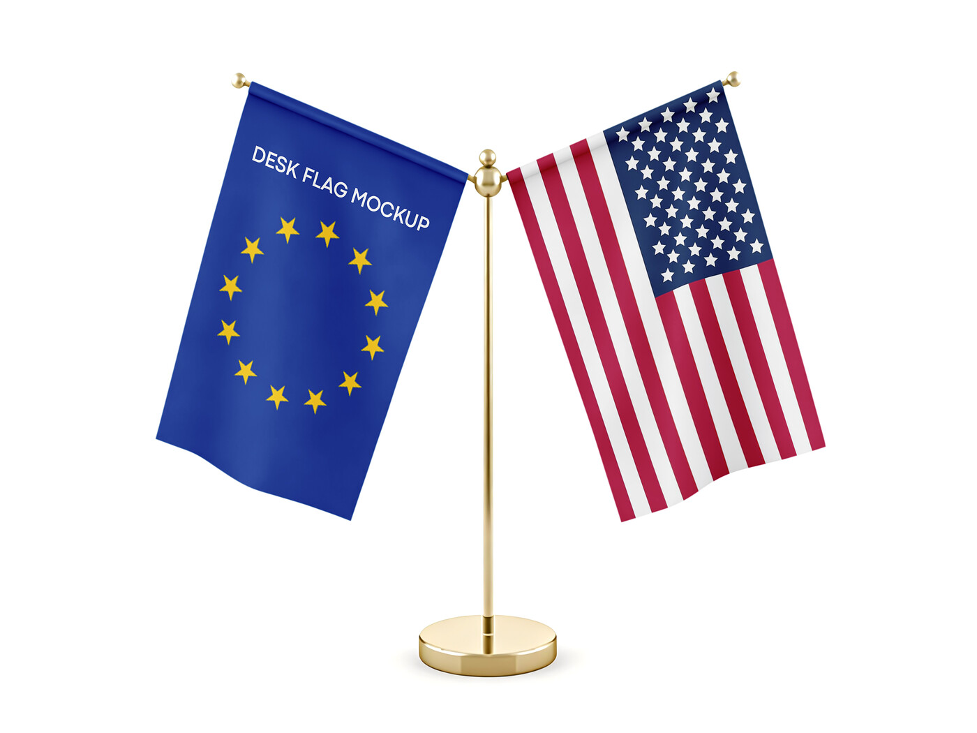 Showcase your diplomatic, business, or organizational branding with this professional desktop flag mockup, which features the flags of the United States and the European Union mounted on a polished gold stand. This mockup is perfect for government agencies, international businesses, or political organizations needing a sophisticated presentation for bilateral relations or cross-border partnerships.