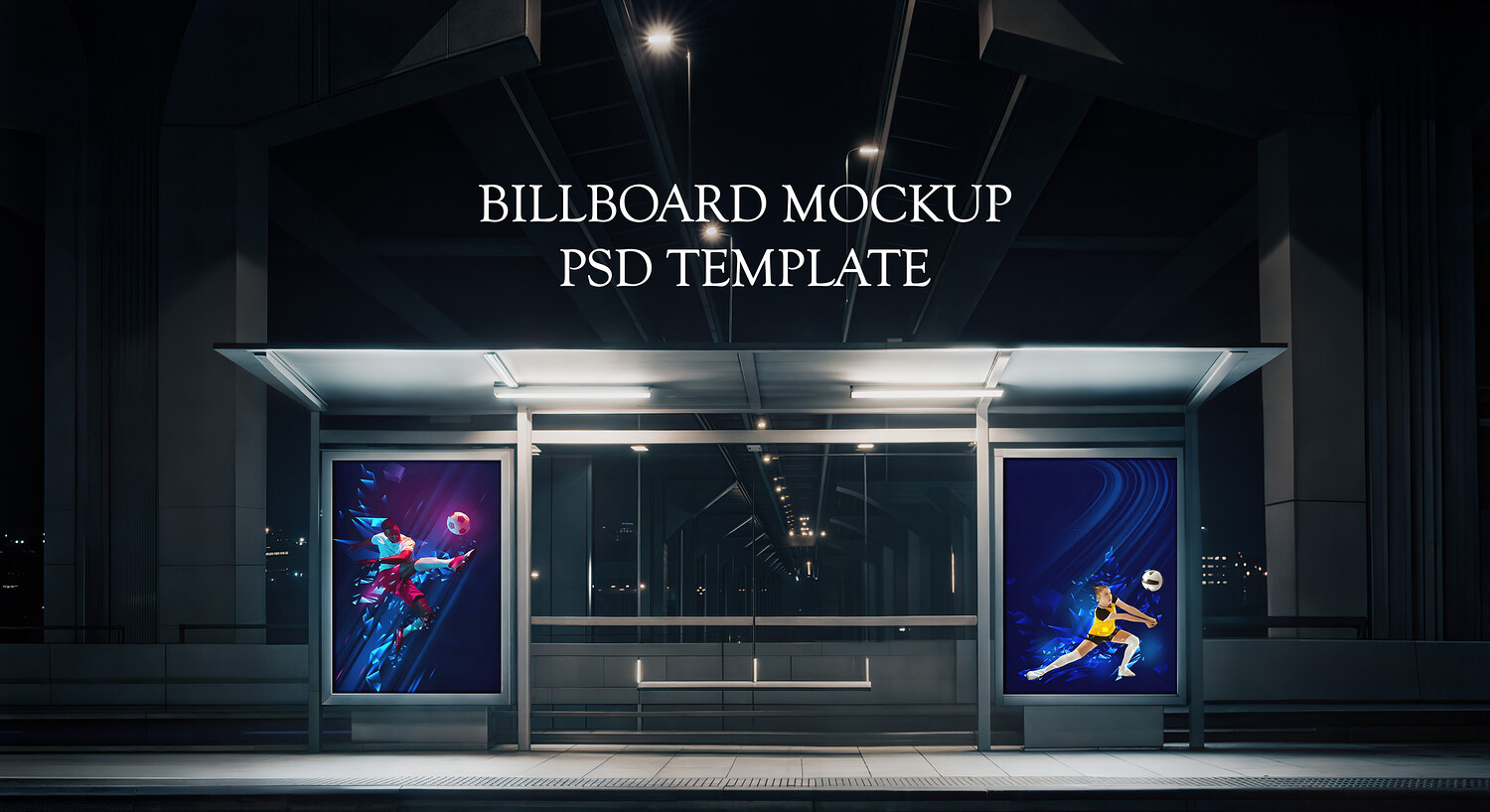 Make your outdoor advertising campaigns shine with this high-impact billboard mockup featuring an urban bus shelter at night. This template showcases two vertical lightboxes set against a modern, moody city backdrop with realistic nighttime illumination. It is an ideal tool for graphic designers and marketing agencies to present sports branding, event posters, or commercial advertisements in a professional, real-world environment that highlights visibility and lighting effects.