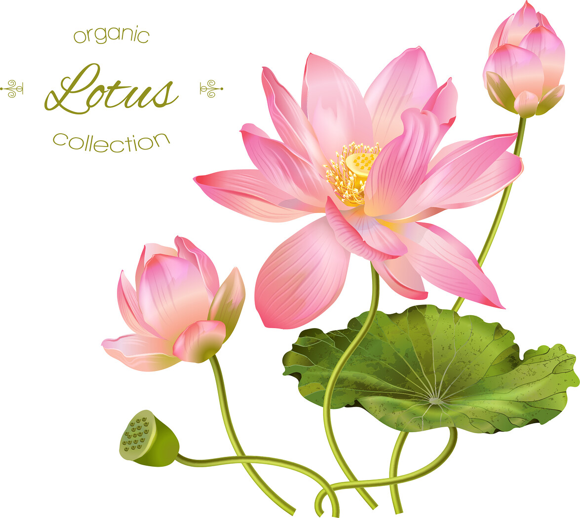Pink Lotus Flower, Buds, Green Leaves, Floral Illustration, EPS File