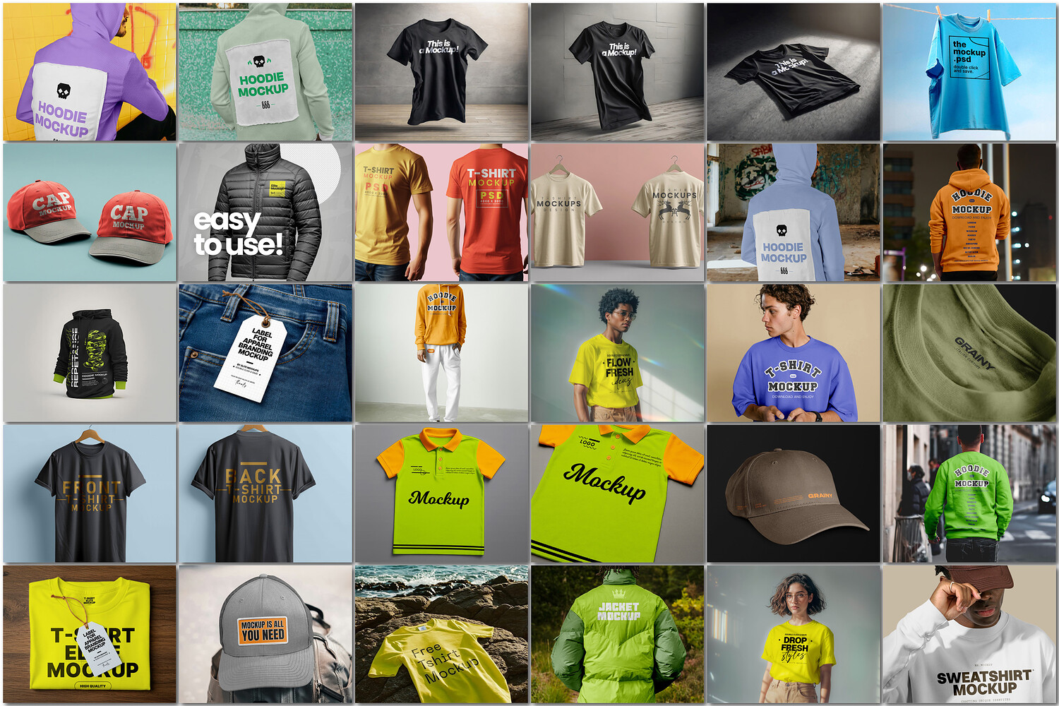 A versatile collection of 30 apparel mockups showcasing T-shirts, hoodies, caps, and labels in various layouts, ideal for design presentations and branding concepts.