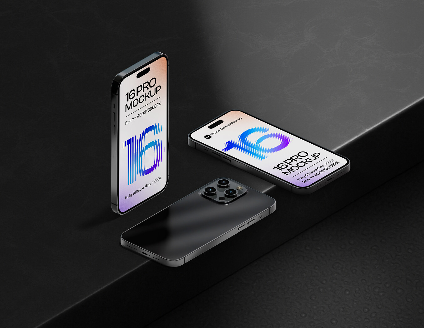 Showcase the full depth of your mobile project with this Multi-View iPhone 16 Pro Mockup PSD Template. This powerful, dynamic scene features three perspectives of the modern smartphone: two angled screen views and one rear view, all set on a dramatic black, multi-level surface. The strong, high-contrast lighting is perfect for visualizing a complete product concept, including UI/UX design, device branding, and case/skin concepts. Use the smart objects in the high-resolution PSD file to customize every visible element for a premium, photorealistic result.