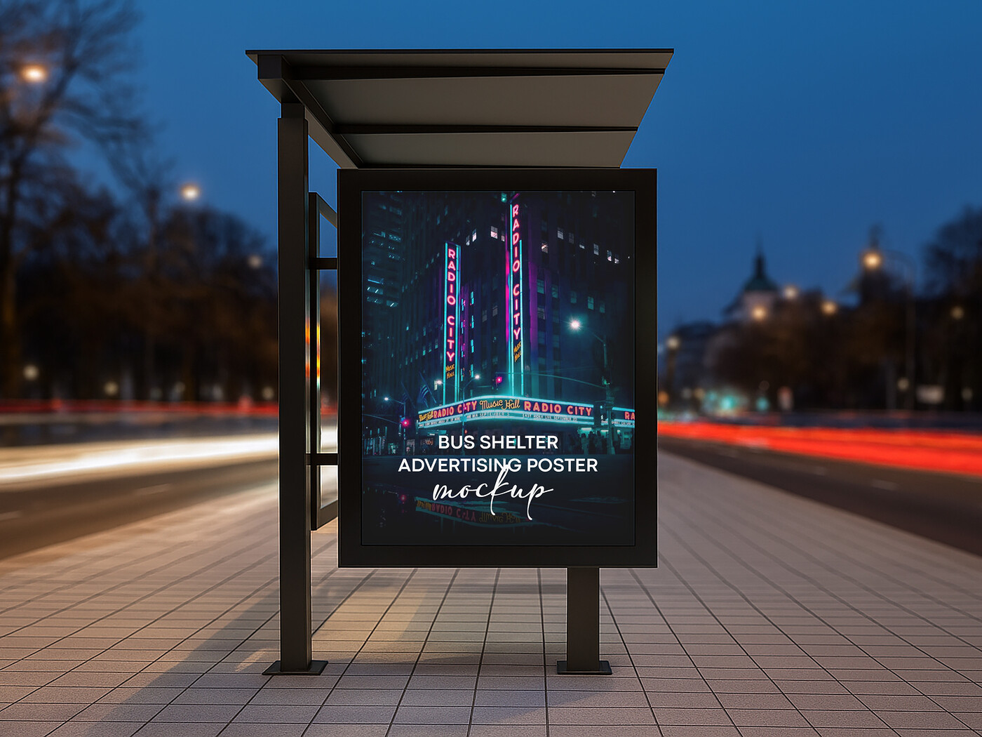 Showcase your advertising campaigns, event promotions, or brand messaging with this highly realistic Night Bus Shelter Poster Mockup. This high-quality template features an illuminated advertising panel at a city bus stop at night, complete with light trails in the background, making your design pop. It's perfect for presenting your ads in a dynamic, real-world urban environment. Simply place your poster design into the smart object layer in the PSD file for an instant, professional presentation.