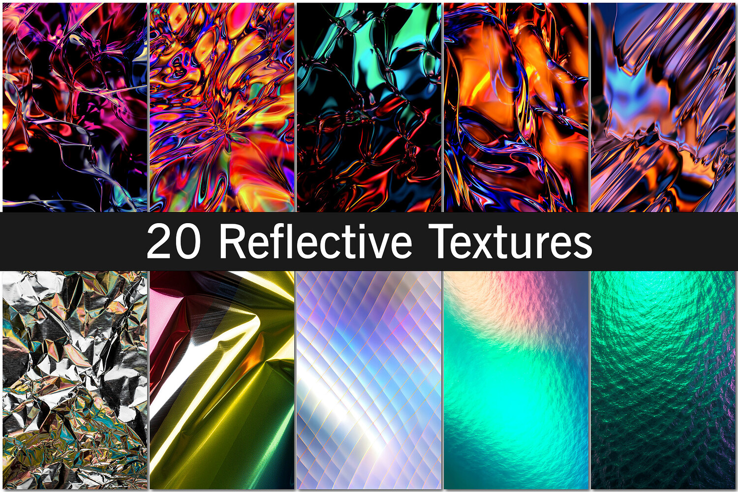 A dynamic collage of 20 reflective textures featuring metallic wrappers, glassy ripples, and iridescent surfaces in bold colors. Ideal for backgrounds, graphic design, branding, and product visuals.