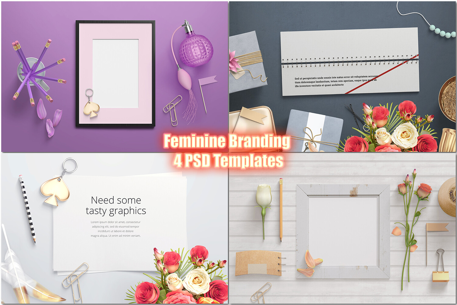 Feminine Branding Mockup, 4 PSD Templates, Chic Purple, Florals, Beauty, Office