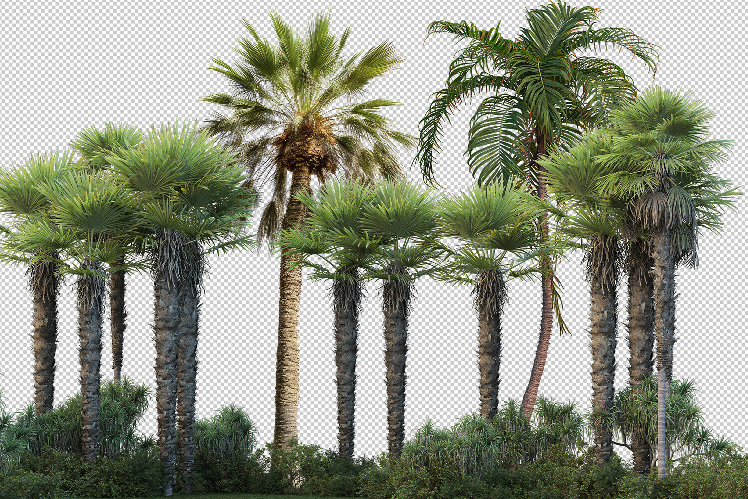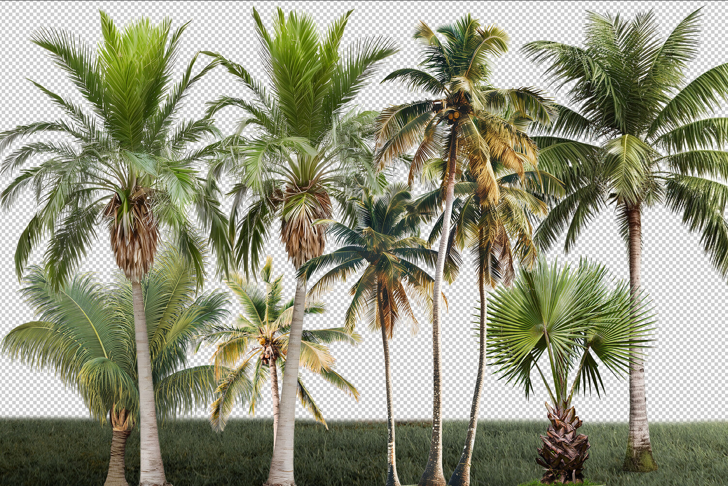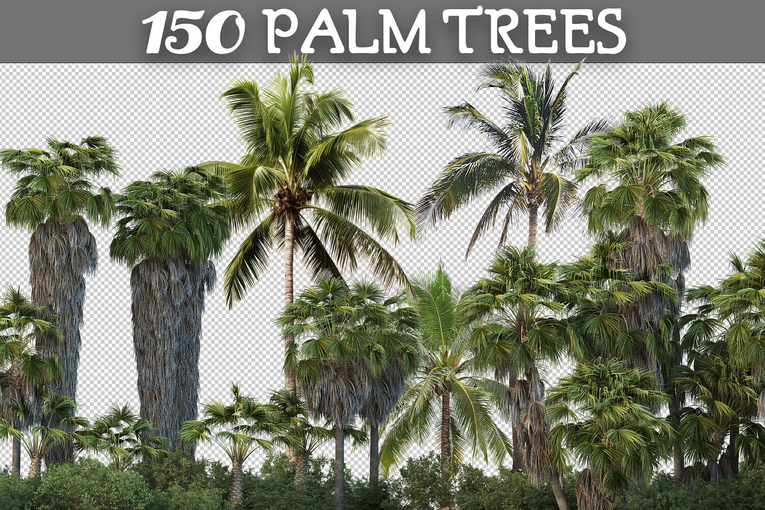 THIS ITEM CONTAINS: - 150 Tropical Palm Trees - PNG files with transparent background - resolution 3000x3000 pixels - Various sizes and shapes available in different lightning conditions