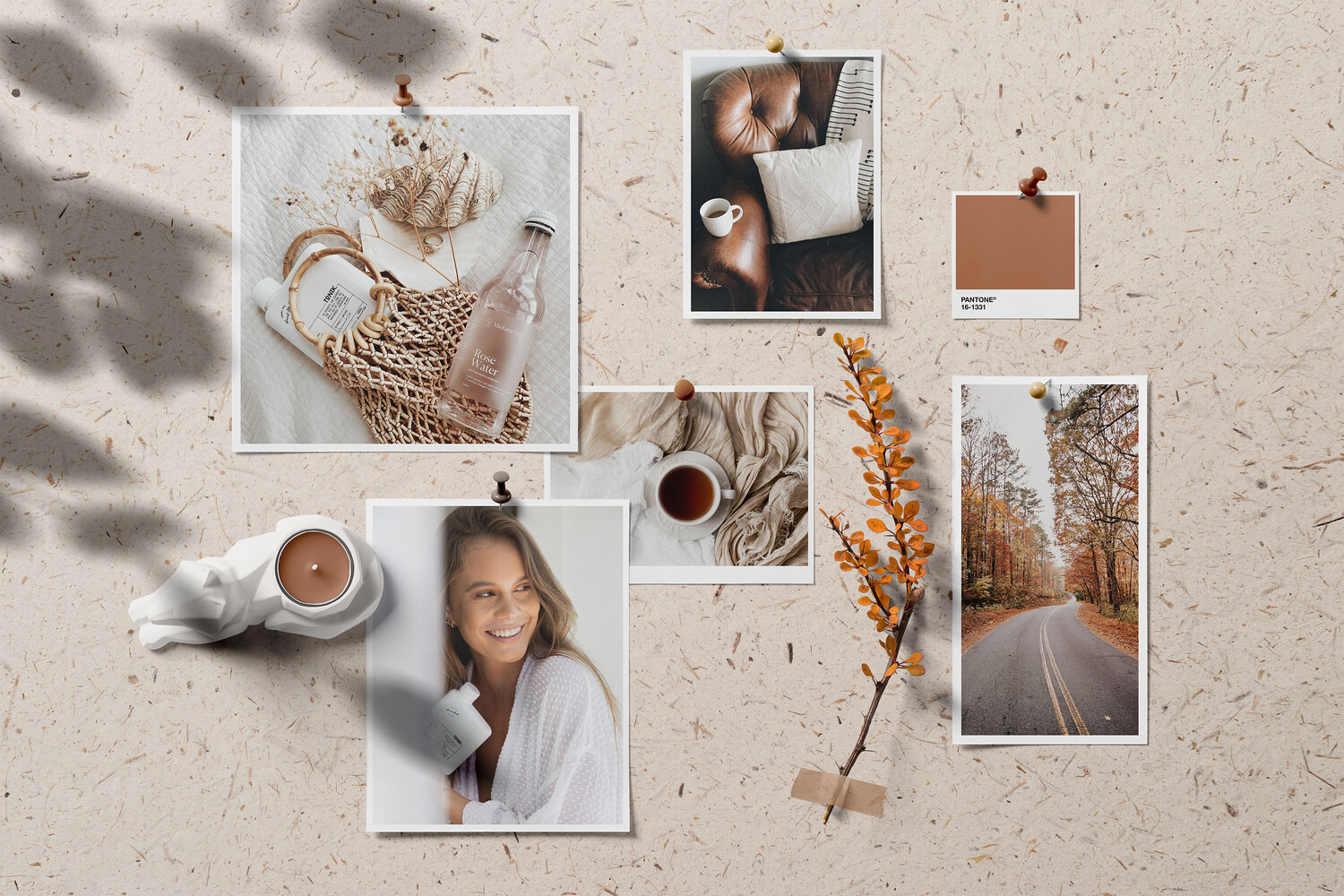 Create an evocative visual story with this premium Lifestyle Moodboard Mockup PSD Template. This professional, premade project features a curated arrangement of polaroid-style photos, a Pantone® color swatch, and organic elements pinned to a textured, handmade paper background. Enhanced with realistic botanical leaf shadows and tactile 3D objects like a ceramic candle and a dried autumn branch, it provides a warm and authentic environment for showcasing photography portfolios, brand color palettes, or social media aesthetic concepts.