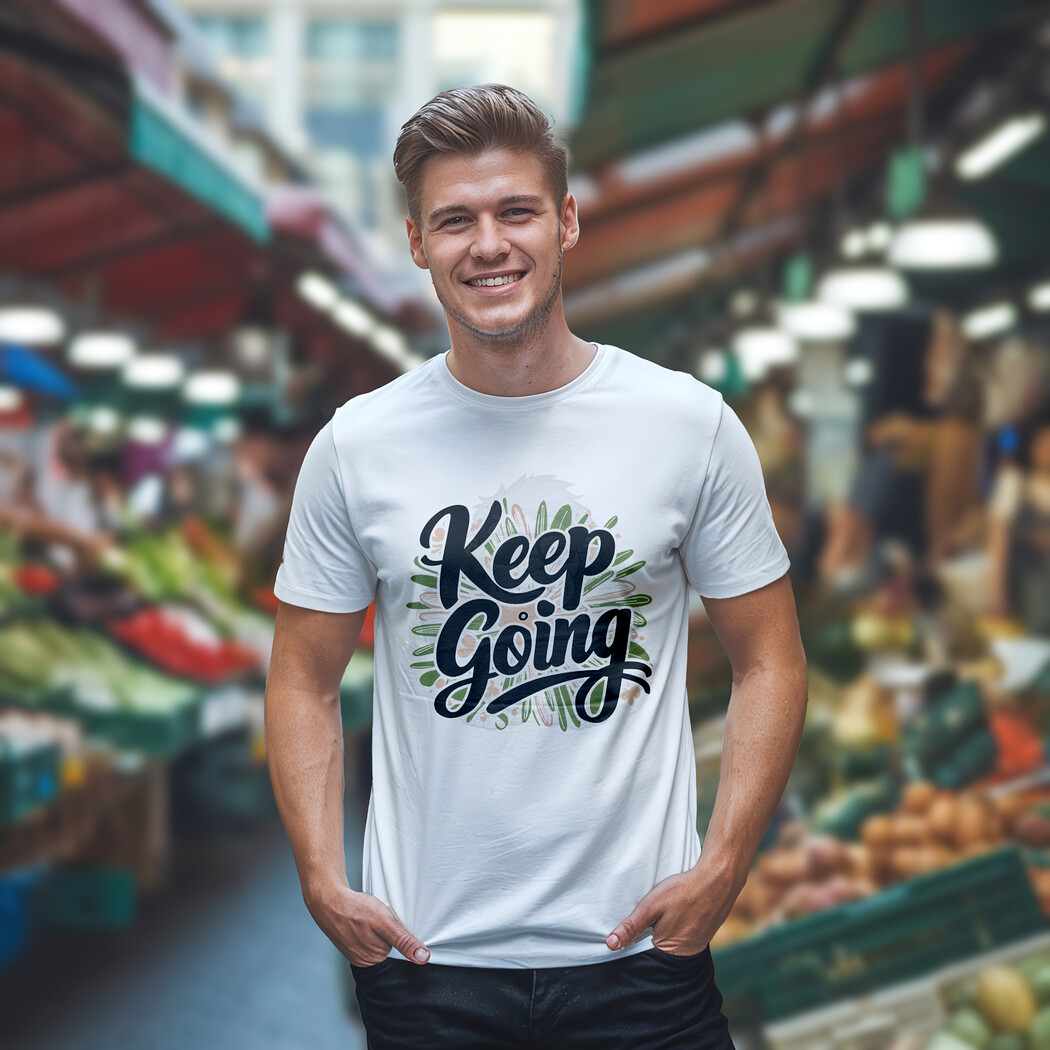 Casual White T-Shirt Mockup PSD Template - Man in Market Scene