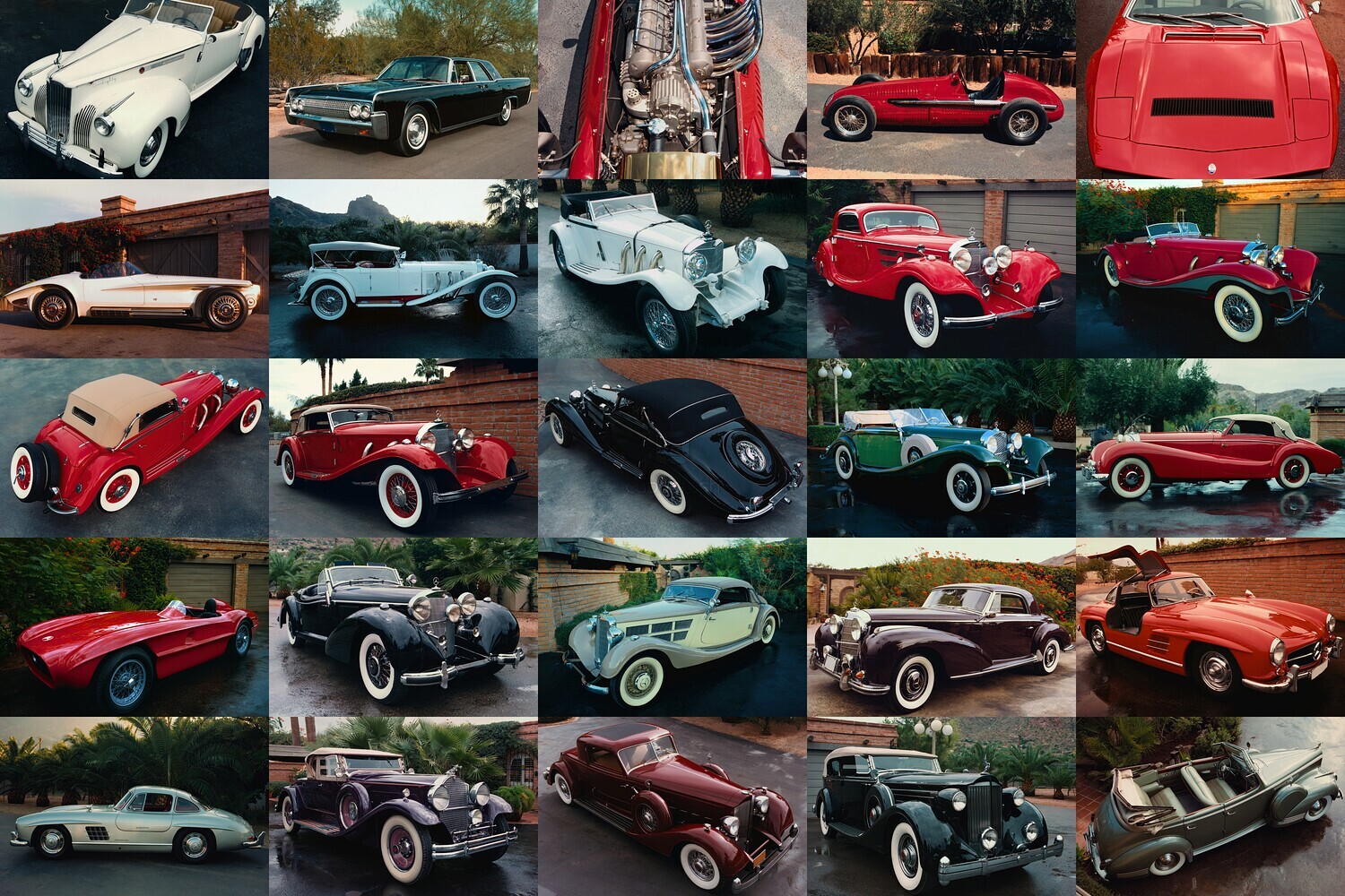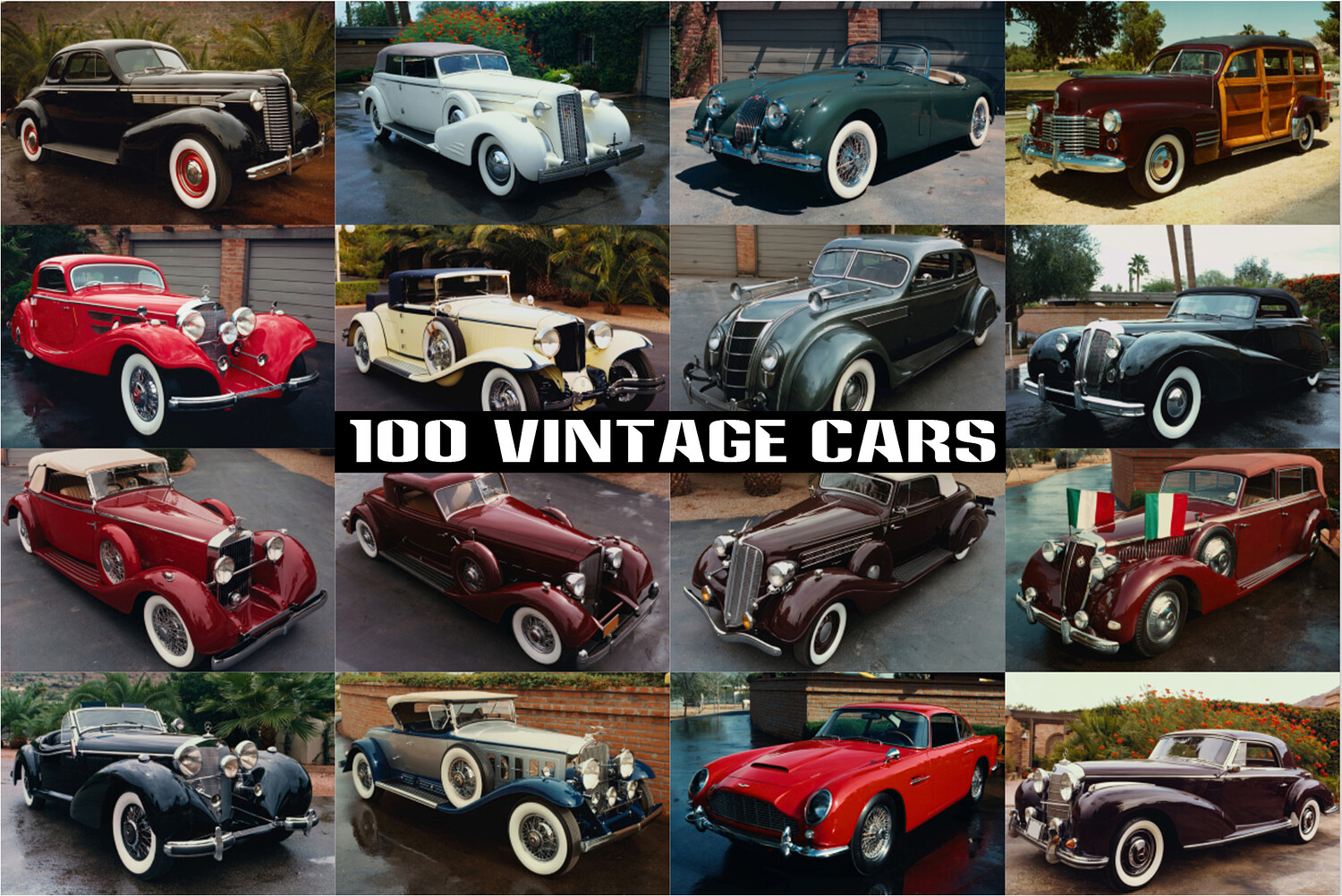 This collection features a prestigious gallery of 100 ultra-high-resolution vintage automobiles, capturing the peak of mid-century luxury and automotive engineering. The imagery showcases a diverse range of body styles, from sleek, sweeping coupes and grand four-door sedans to elegant open-top roadsters and rare wood-paneled station wagons.