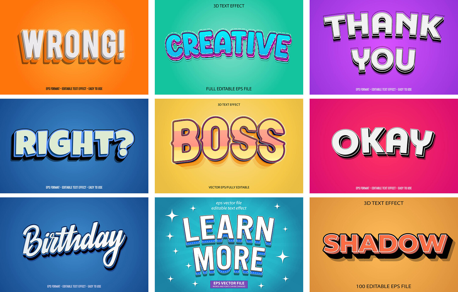 A vibrant collection of bold, comic-style text effects with 3D depth, shadows, and bright gradients. Perfect for headlines, banners, and punchy social media visuals.