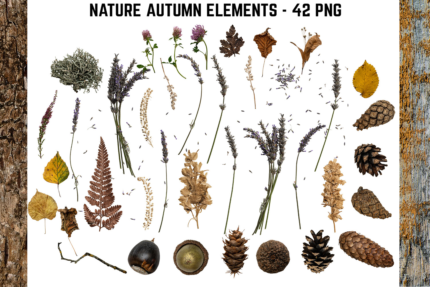 42 Nature Autumn Elements, Dried Leaves, Seeds, Cones, Grasses - PNG