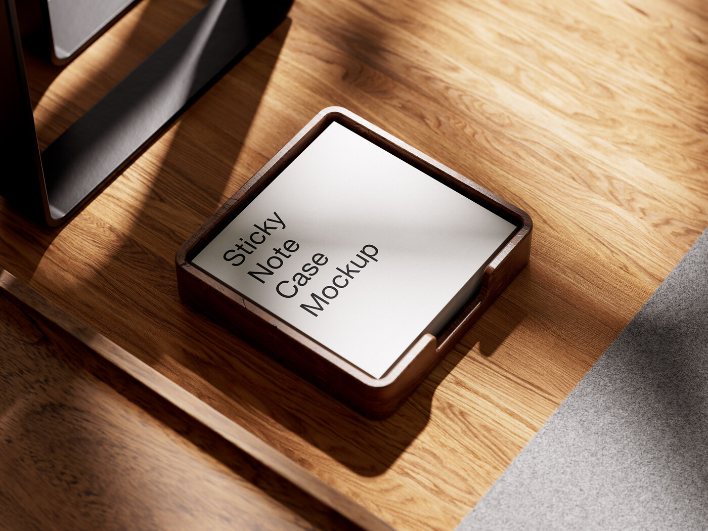 Wooden Sticky Note Case Mockup PSD Template on Desk