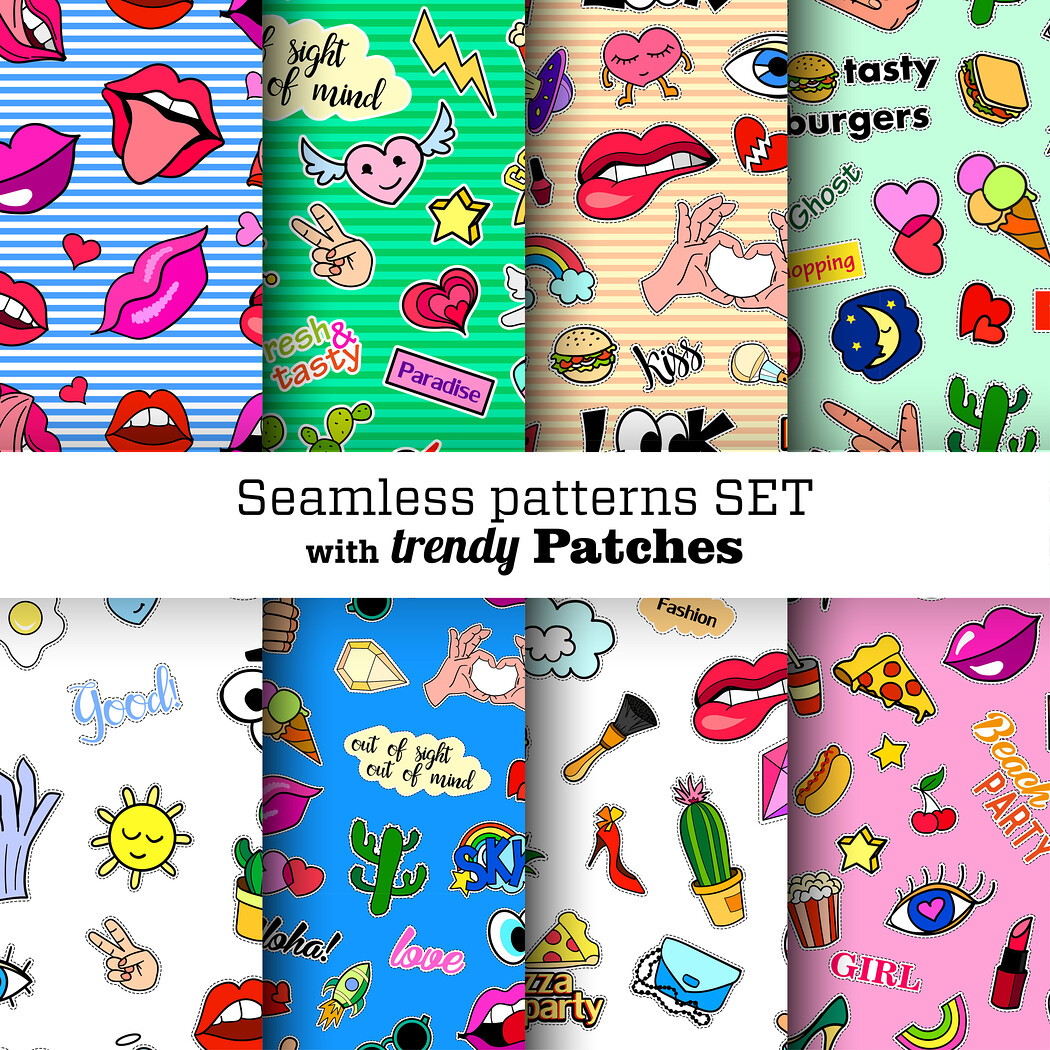 8 Pop Art Trendy Patches Patterns, Vector Seamless Texture, EPS File.
