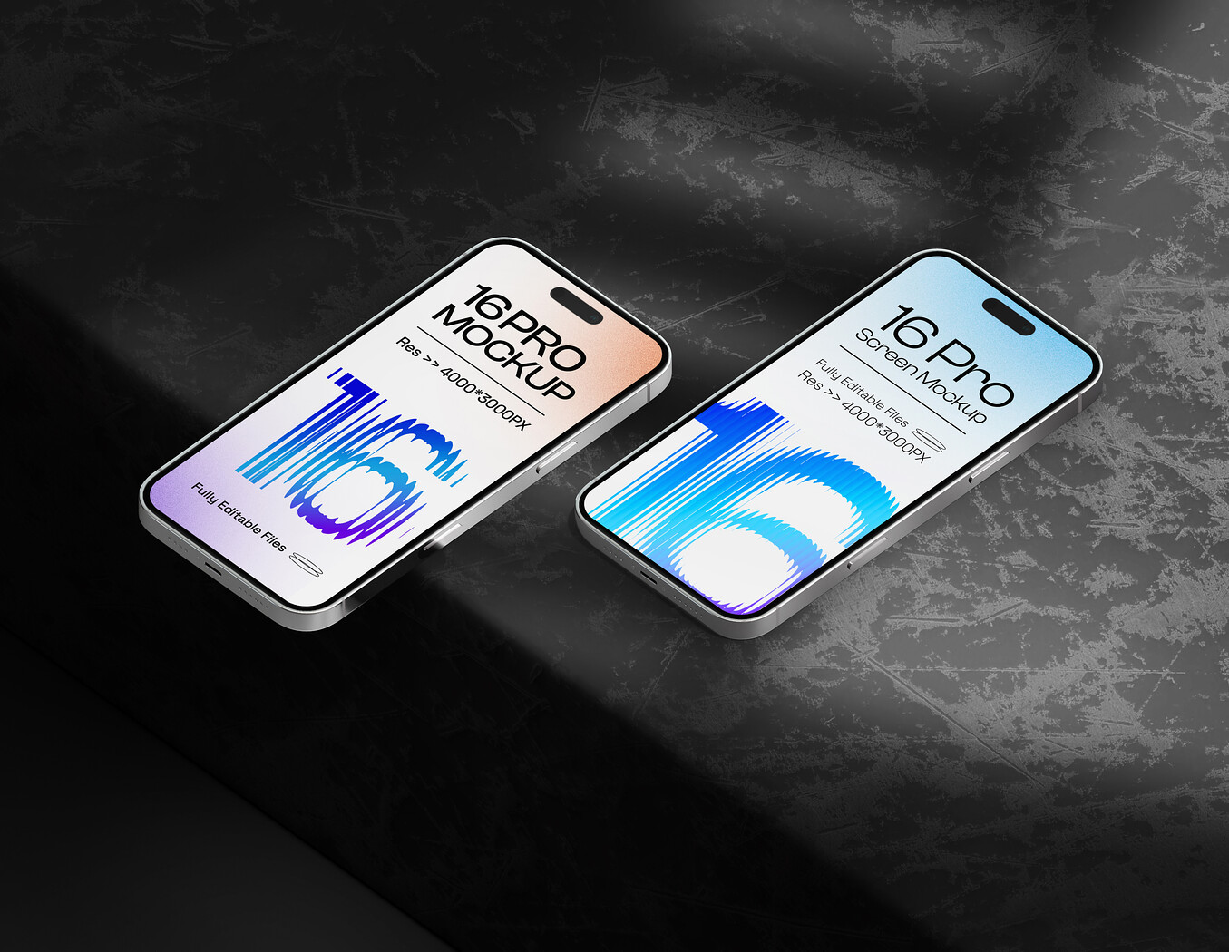 Dual Angled iPhone 16 Pro Mockup PSD Template - Dark Surface Display