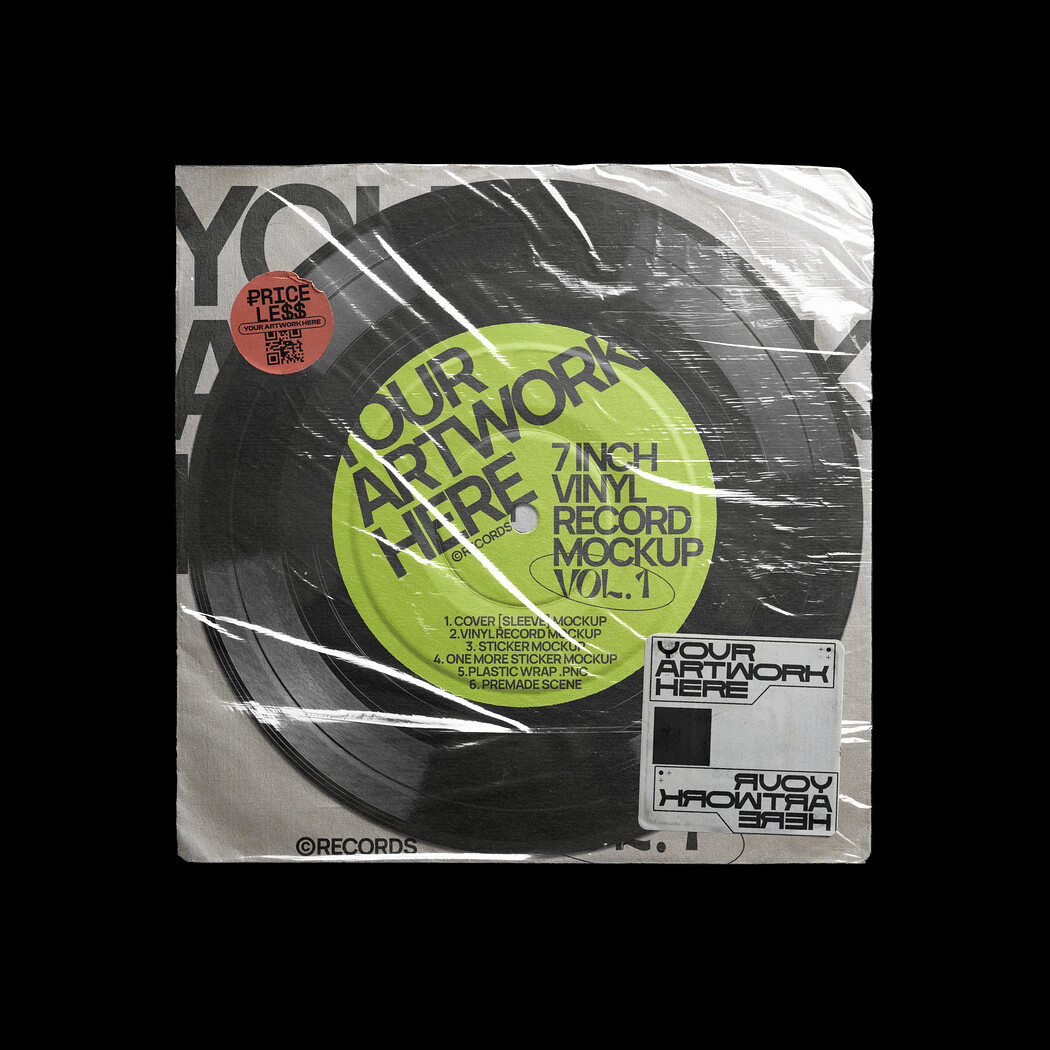 7-Inch Vinyl Record Mockup PSD, Fully Editable Scene, Plastic Wrap, Stickers, Cover