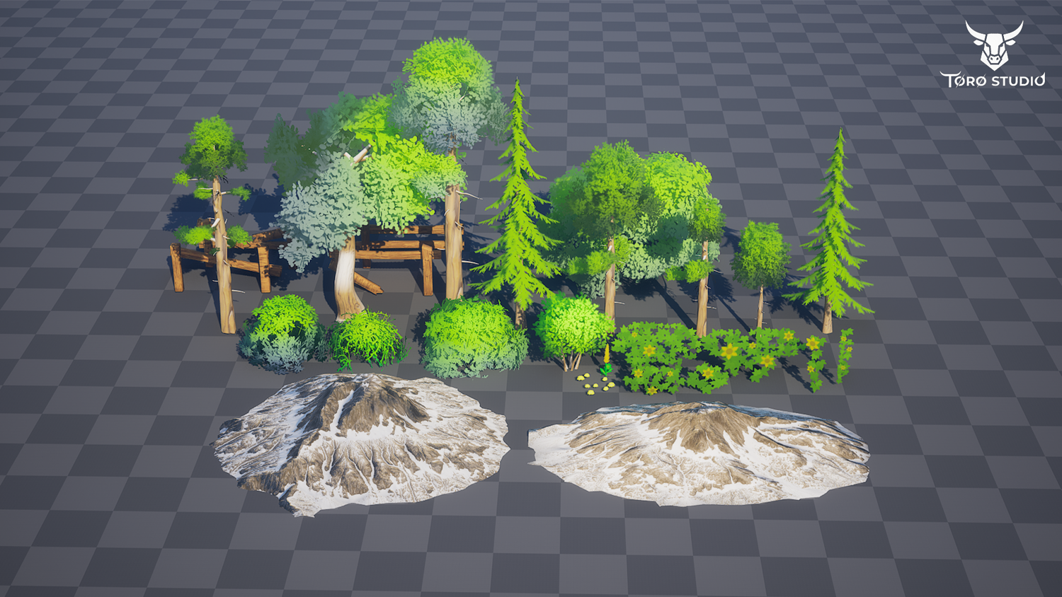 136 stylized assets with full PBR texture maps and variations Game-ready landscapes and stylized shaders Demo scene with complete lighting setup