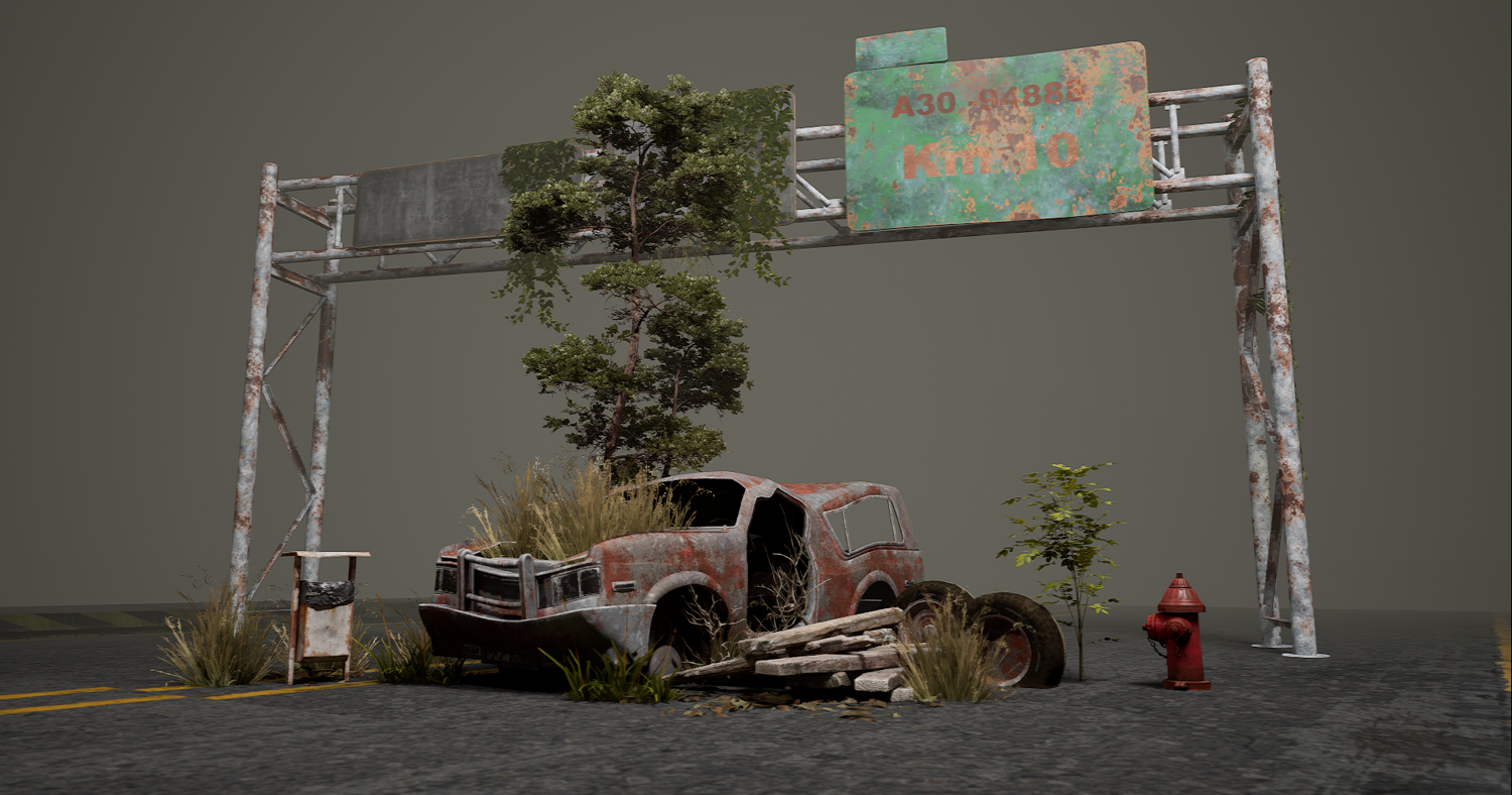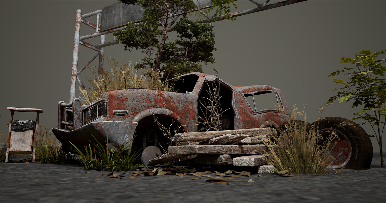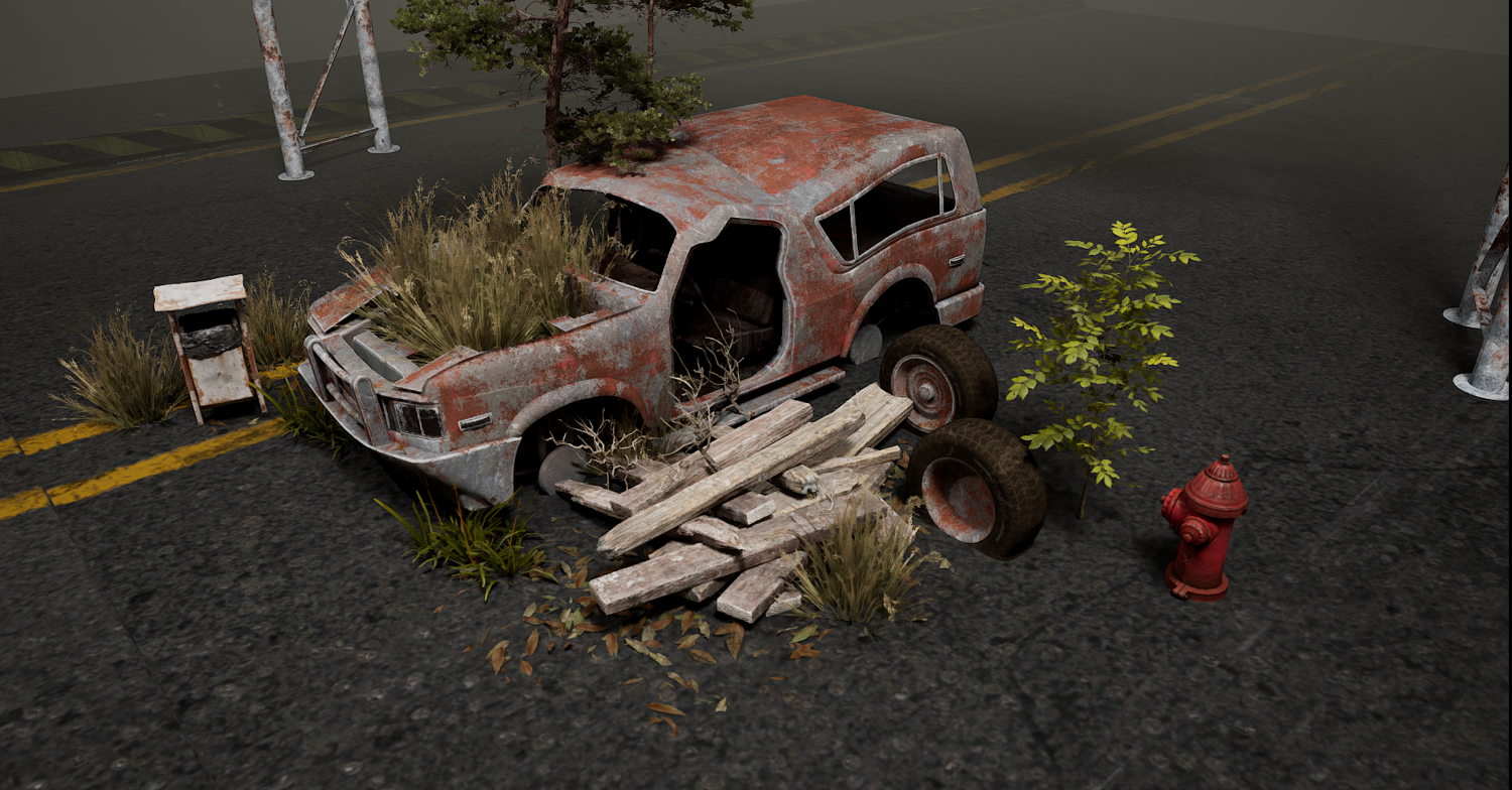 Post-Apocalyptic Cars Abandoned, damaged vehicles designed for harsh post-collapse environments.