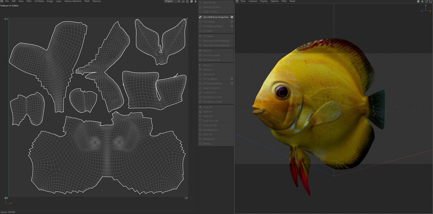INFO: - Asymmetrical fish 3d model - Textures embedded in blender too - Ready to render in Blender with Cycles/EEVEE - Made in Cinema 4d - Auto UV and Auto topolgy done in cinema 4d - Cinema 4d and blender 3d files are textured linked - 4k Textures, Only Diffuse map - Bump and SSS also used in blender - UV mapped - Best for publication, visualition etc.