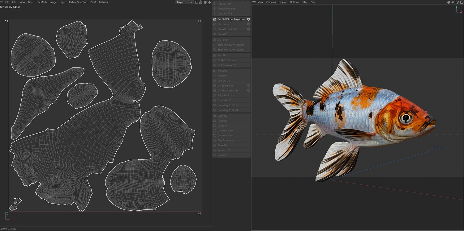 INFO: - Asymmetrical fish 3d model - Textures embedded in blender too - Ready to render in Blender with Cycles/EEVEE - Made in Cinema 4d - Auto UV and Auto topolgy done in cinema 4d - Cinema 4d and blender 3d files are textured linked - 4k Textures, Only Diffuse map - Bump and SSS also used in blender - UV mapped - Best for publication, visualition etc.