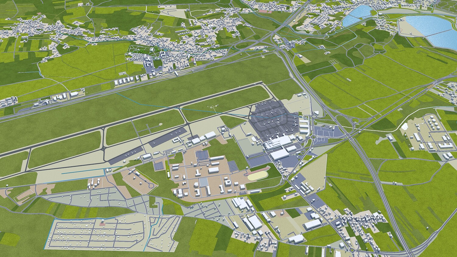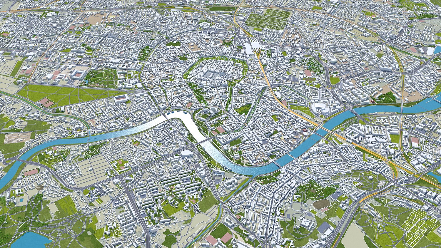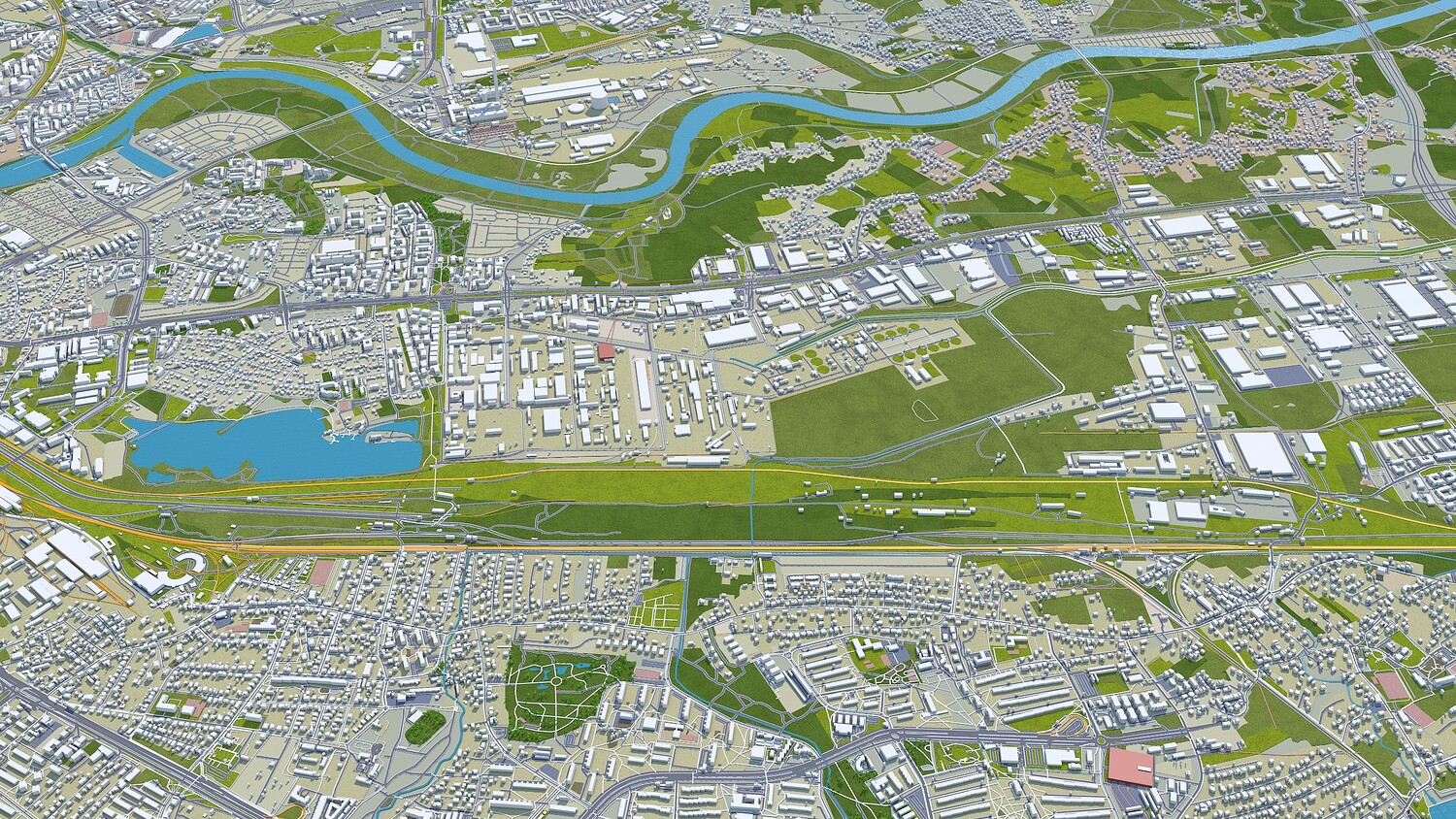 Base satellite texture setup only in Cinema 4D Satellite/map texture is included Made in cinema 4d and Ready to render in standard renderer Stroked building, Trees (mograph cloner), Water Effect and Stroked Roads are only in cinema 4d file No Plugins used Low Poly Royalty free model Polygons: 5m+ in big cities Layers: Building, roads, routes, amenity, leisure, landuse, natural, water, man made, railway/train, aeroway etc. Flat Surface