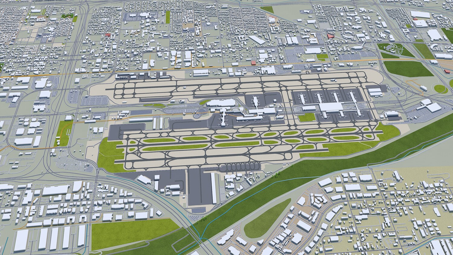Base satellite texture setup only in Cinema 4D Satellite/map texture is included Made in cinema 4d and Ready to render in standard renderer Stroked building, Trees (mograph cloner), Water Effect and Stroked Roads are only in cinema 4d file No Plugins used Low Poly Royalty free model Polygons: 5m+ in big cities Layers: Building, roads, routes, amenity, leisure, landuse, natural, water, man made, railway/train, aeroway etc. Flat Surface