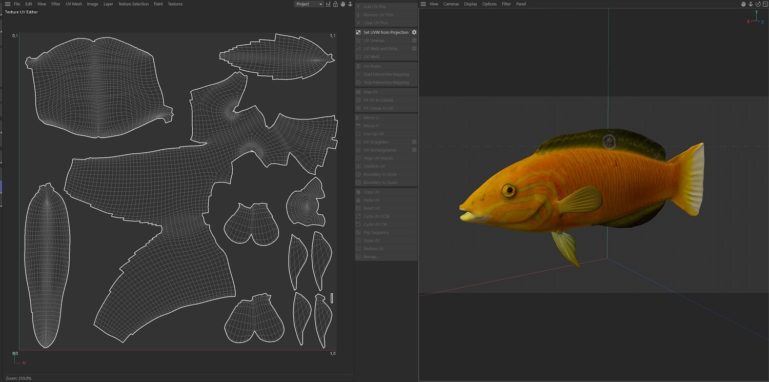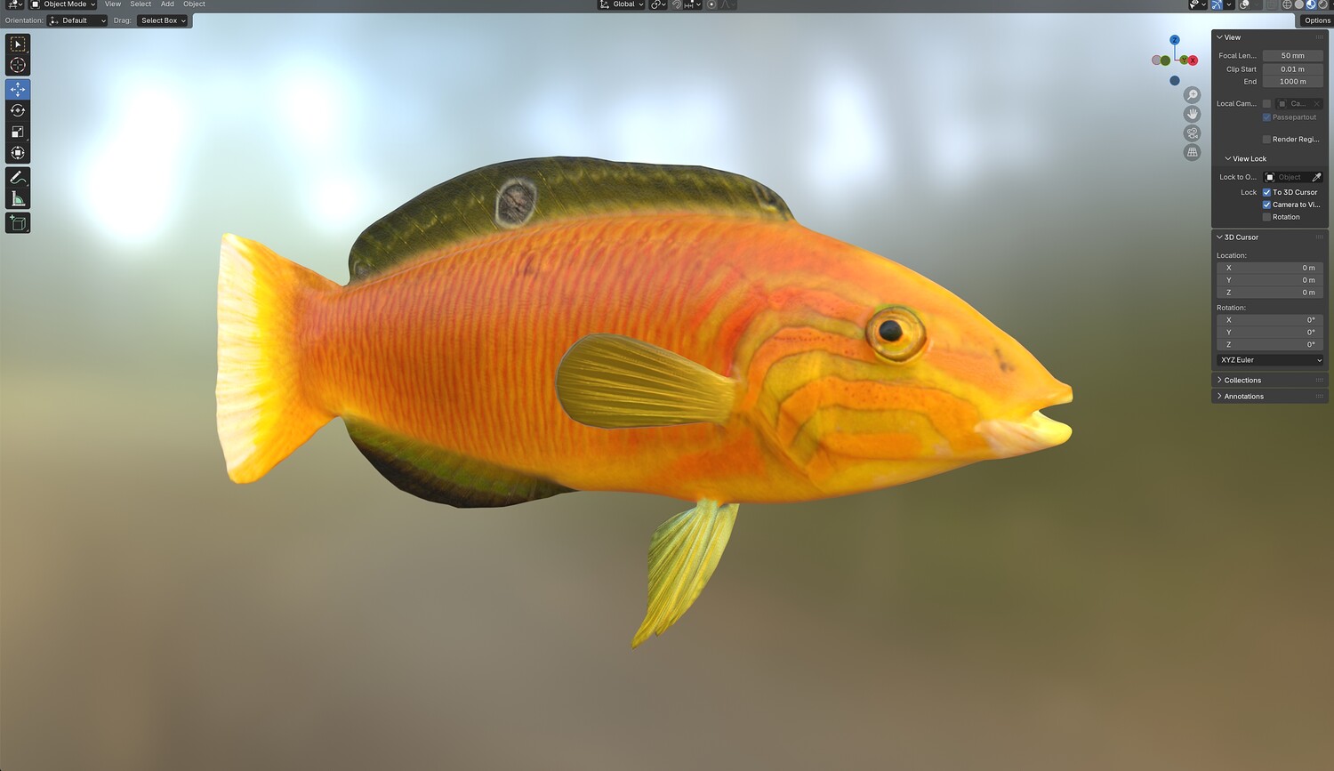 INFO: - Asymmetrical fish 3d model - Textures embedded in blender too - Ready to render in Blender with Cycles/EEVEE - Made in Cinema 4d - Auto UV and Auto topolgy done in cinema 4d - Cinema 4d and blender 3d files are textured linked - 4k Textures, Only Diffuse map - Bump and SSS also used in blender - UV mapped - Best for publication, visualition etc.