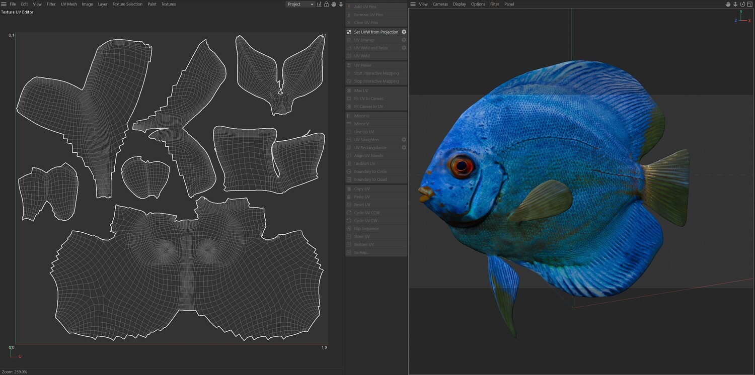 INFO: - Asymmetrical fish 3d model - Textures embedded in blender too - Ready to render in Blender with Cycles/EEVEE - Made in Cinema 4d - Auto UV and Auto topolgy done in cinema 4d - Cinema 4d and blender 3d files are textured linked - 4k Textures, Only Diffuse map - Bump and SSS also used in blender - UV mapped - Best for publication, visualition etc.
