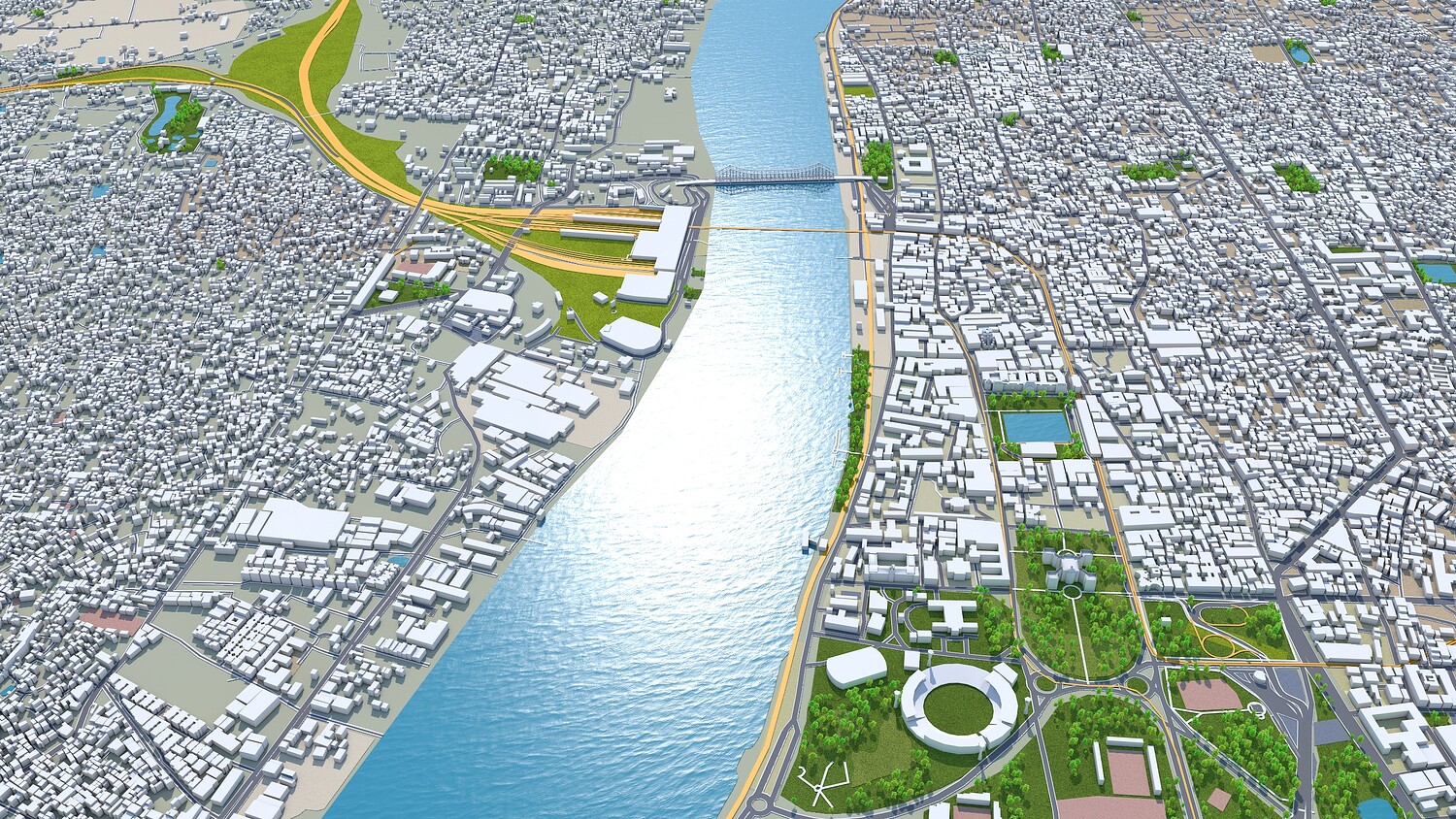 Base satellite texture setup only in Cinema 4D Satellite/map texture is included Made in cinema 4d and Ready to render in standard renderer Stroked building, Trees (mograph cloner), Water Effect and Stroked Roads are only in cinema 4d file No Plugins used Low Poly Royalty free model Polygons: 5m+ in big cities Layers: Building, roads, routes, amenity, leisure, landuse, natural, water, man made, railway/train, aeroway etc. Flat Surface