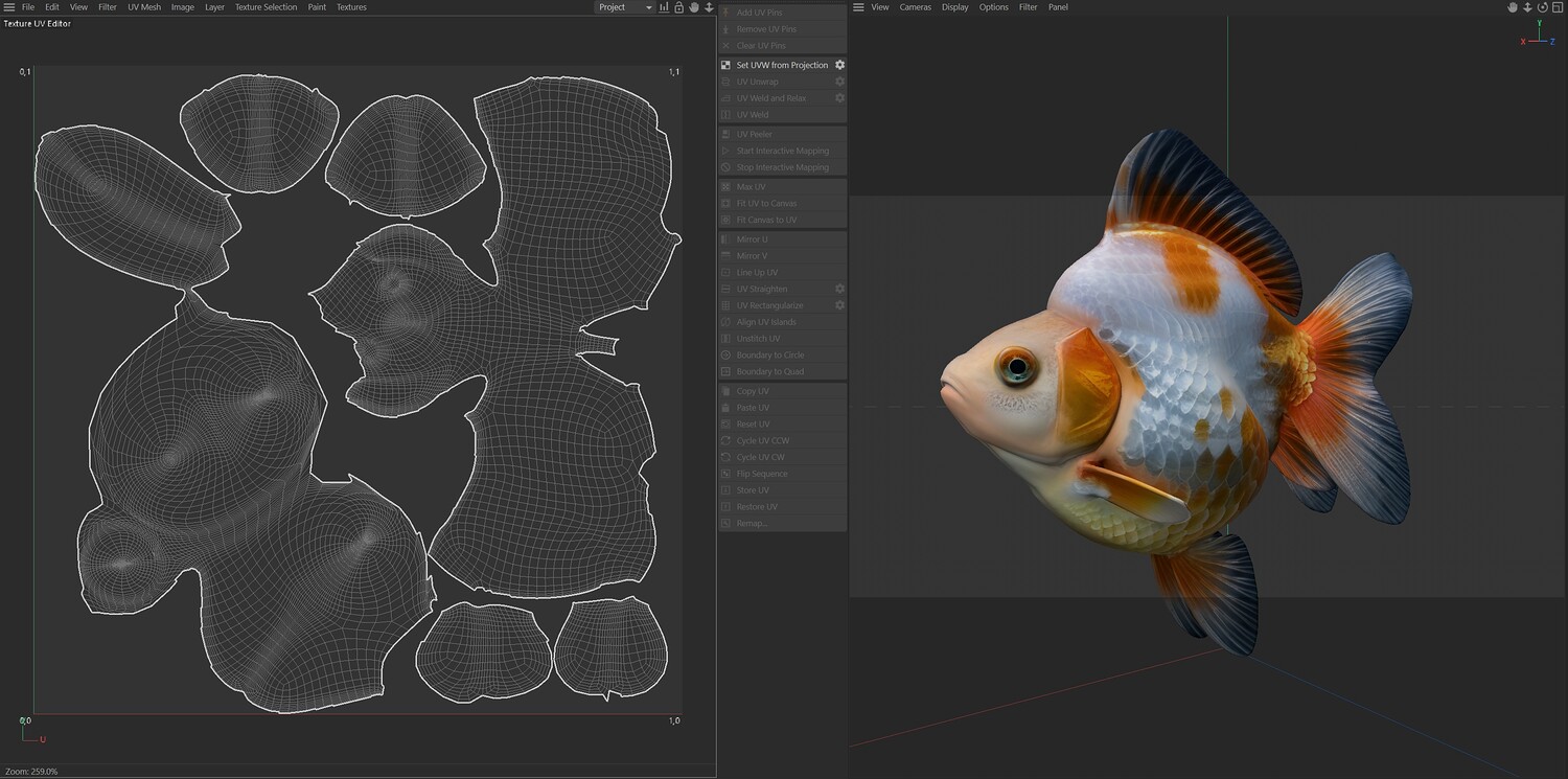 INFO: - Asymmetrical fish 3d model - Textures embedded in blender too - Ready to render in Blender with Cycles/EEVEE - Made in Cinema 4d - Auto UV and Auto topolgy done in cinema 4d - Cinema 4d and blender 3d files are textured linked - 4k Textures, Only Diffuse map - Bump and SSS also used in blender - UV mapped - Best for publication, visualition etc.