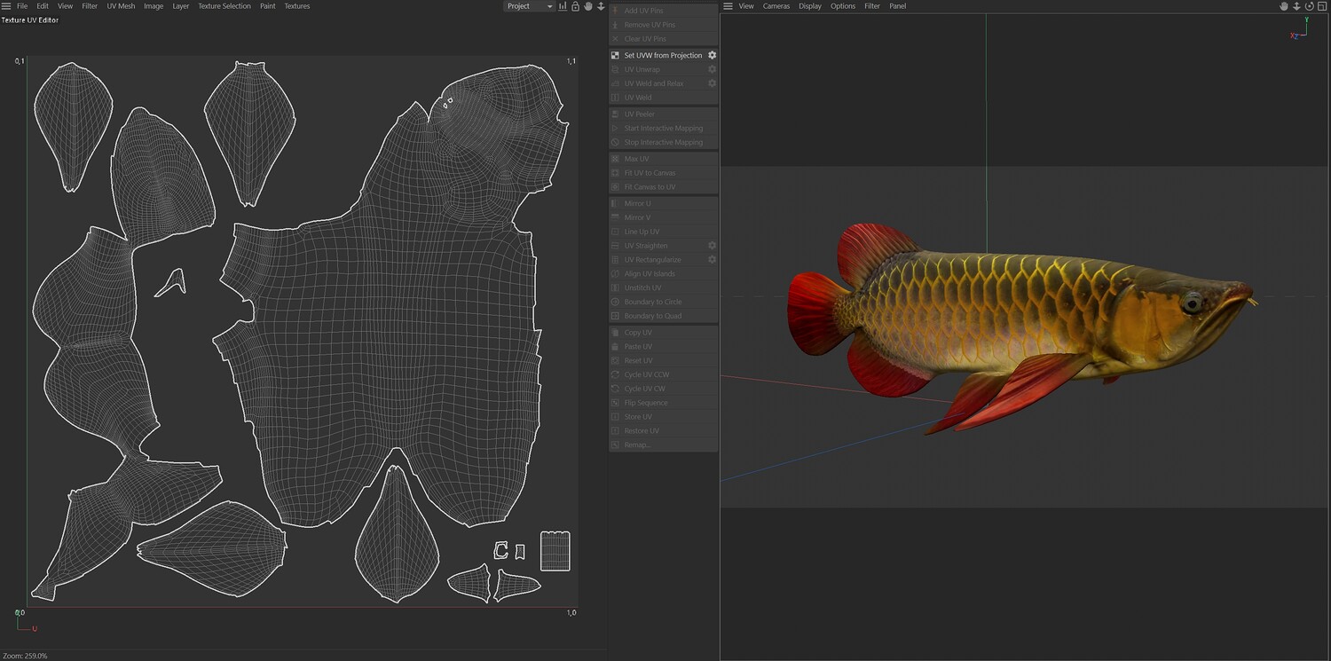 INFO: - Asymmetrical fish 3d model - Textures embedded in blender too - Ready to render in Blender with Cycles/EEVEE - Made in Cinema 4d - Auto UV and Auto topolgy done in cinema 4d - Cinema 4d and blender 3d files are textured linked - 4k Textures, Only Diffuse map - Bump and SSS also used in blender - UV mapped - Best for publication, visualition etc.