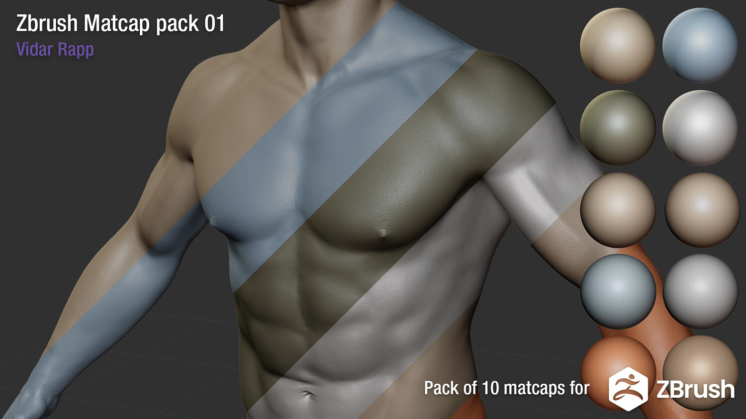 Pack of 10 simple Zbrush matcaps for good sculpting performance. For use in Zbrush 2022 and up.