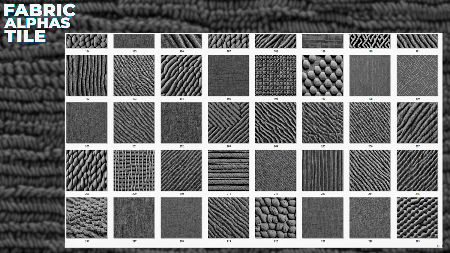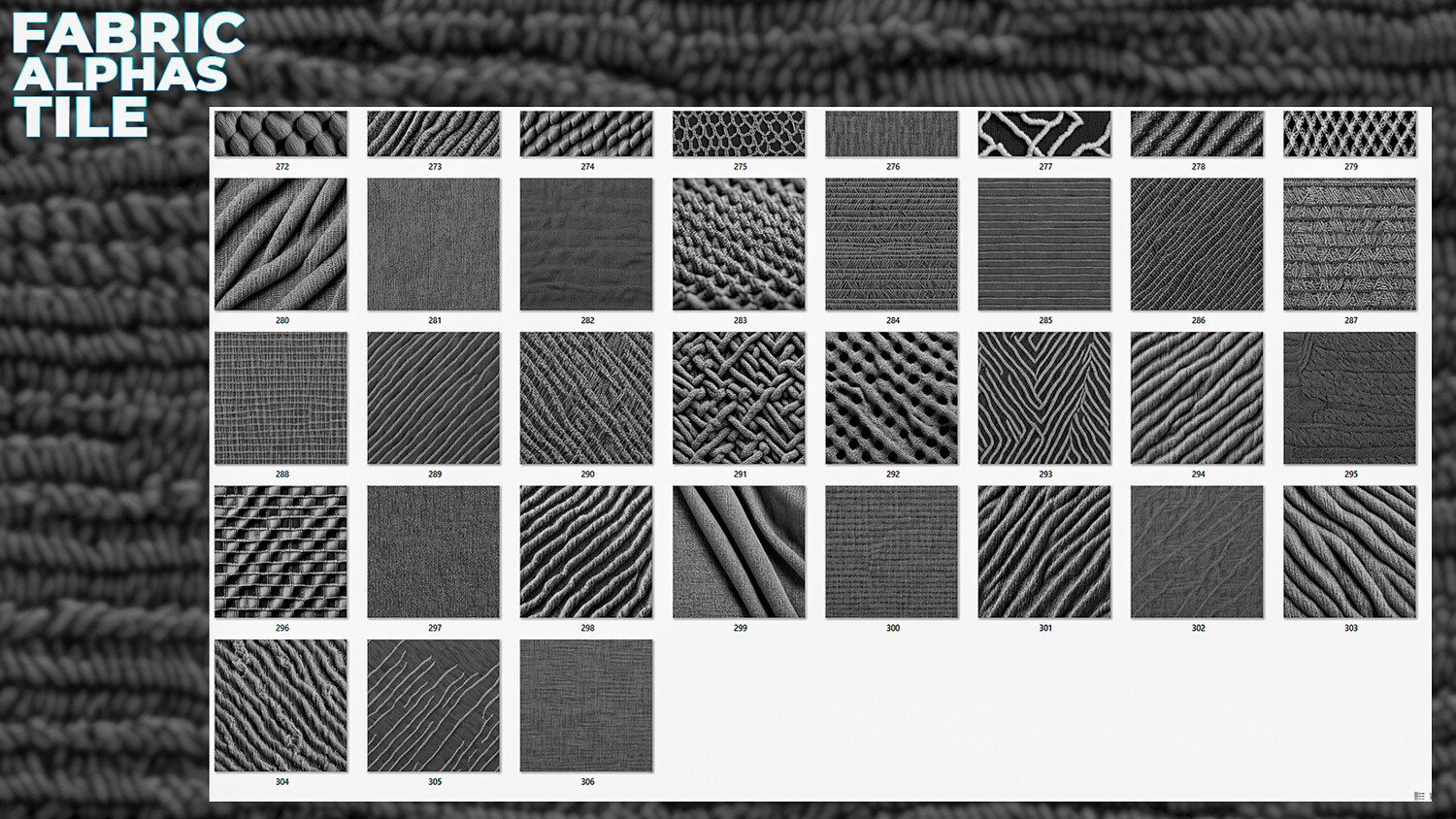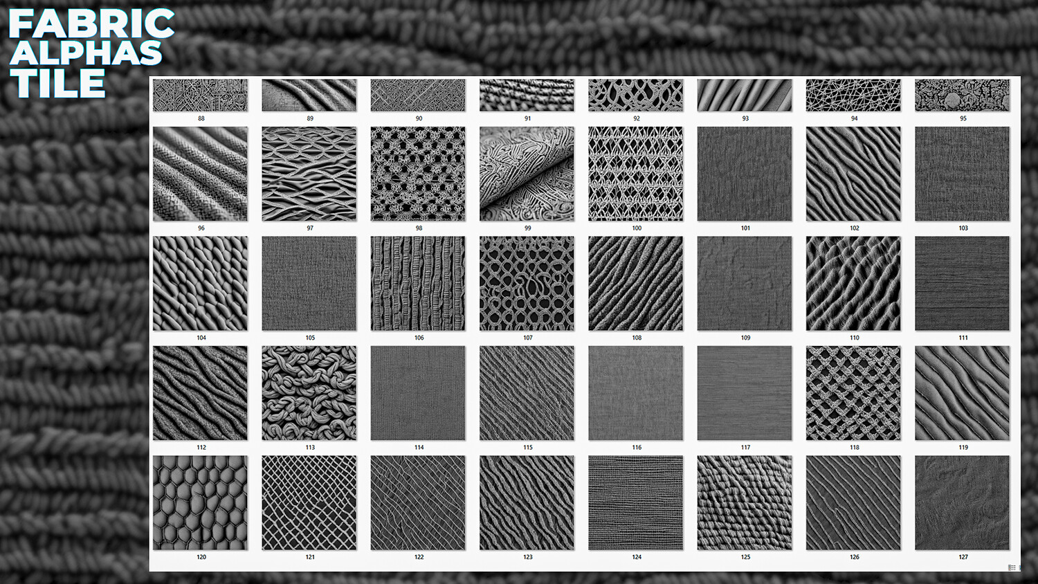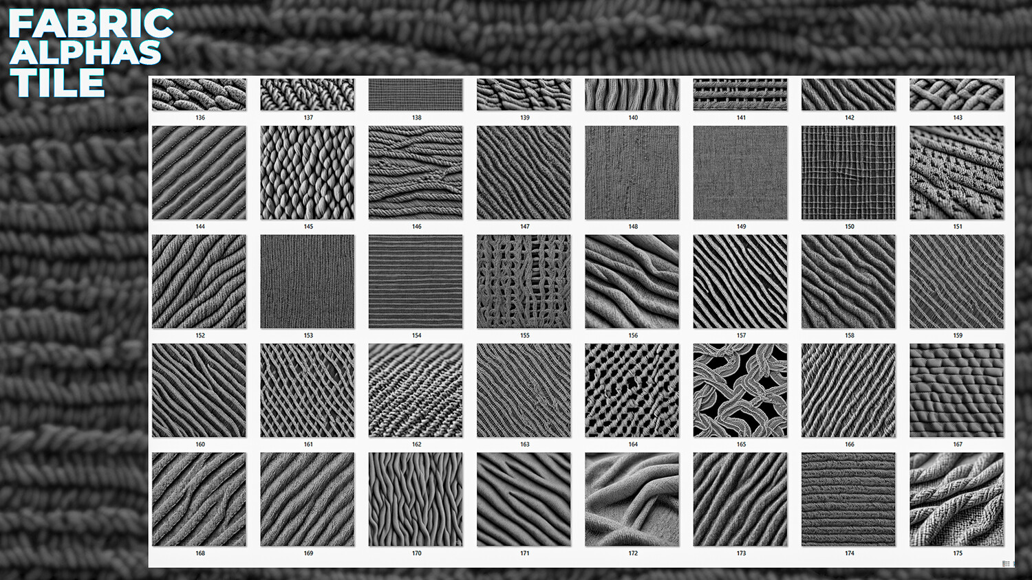 Pack contains 361 alphas maps (PNG) to add fabric (cloth) detail to your mesh in Zbrush, Substance Painter and other program.