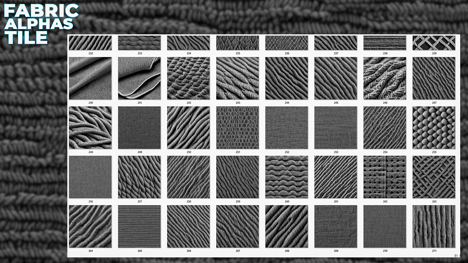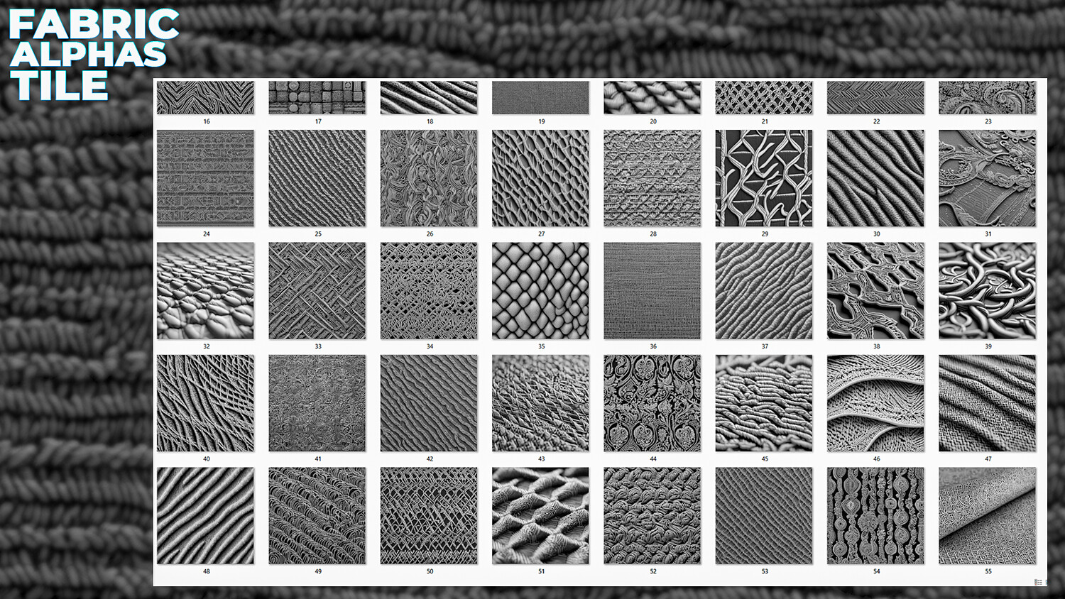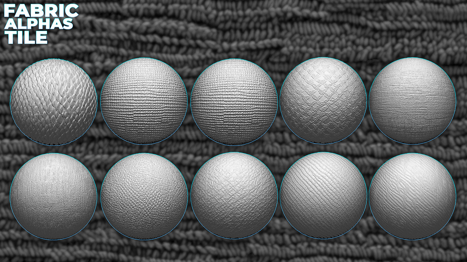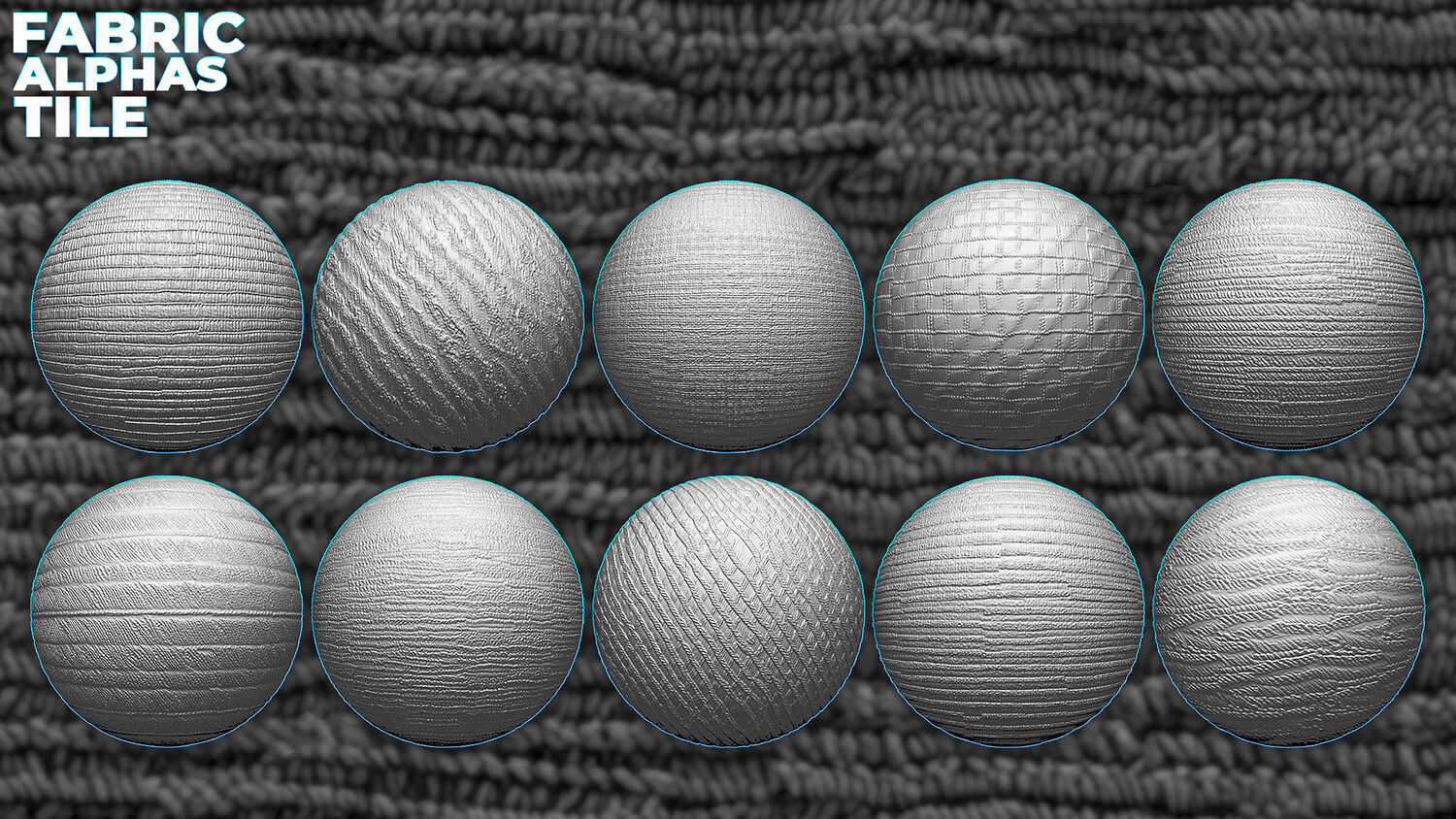 Pack contains 361 alphas maps (PNG) to add fabric (cloth) detail to your mesh in Zbrush, Substance Painter and other program.