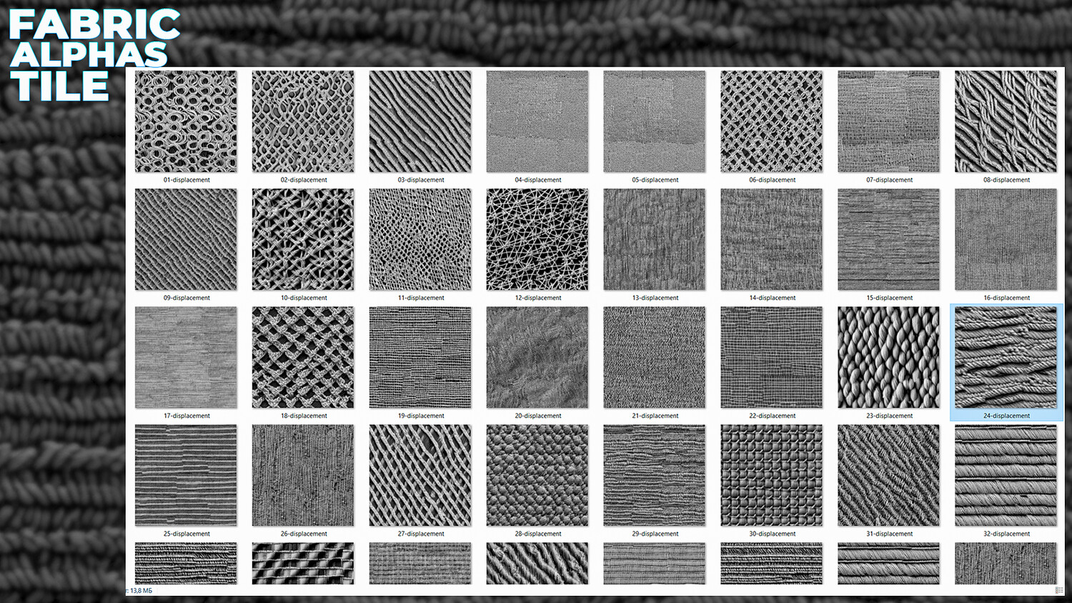 350+ Fabric Displacement Map (Alphas) for ZBrush, Blender vol.13