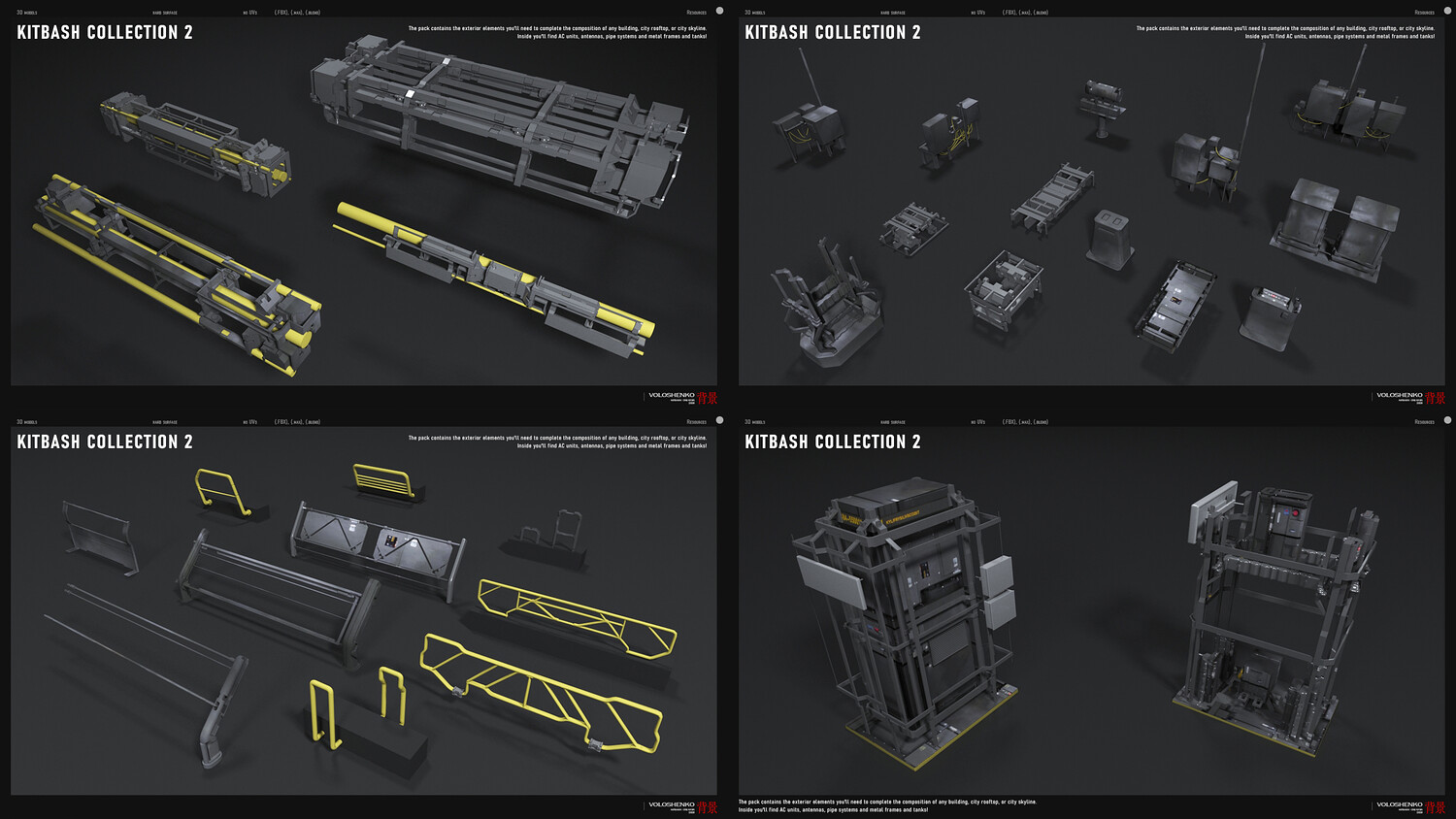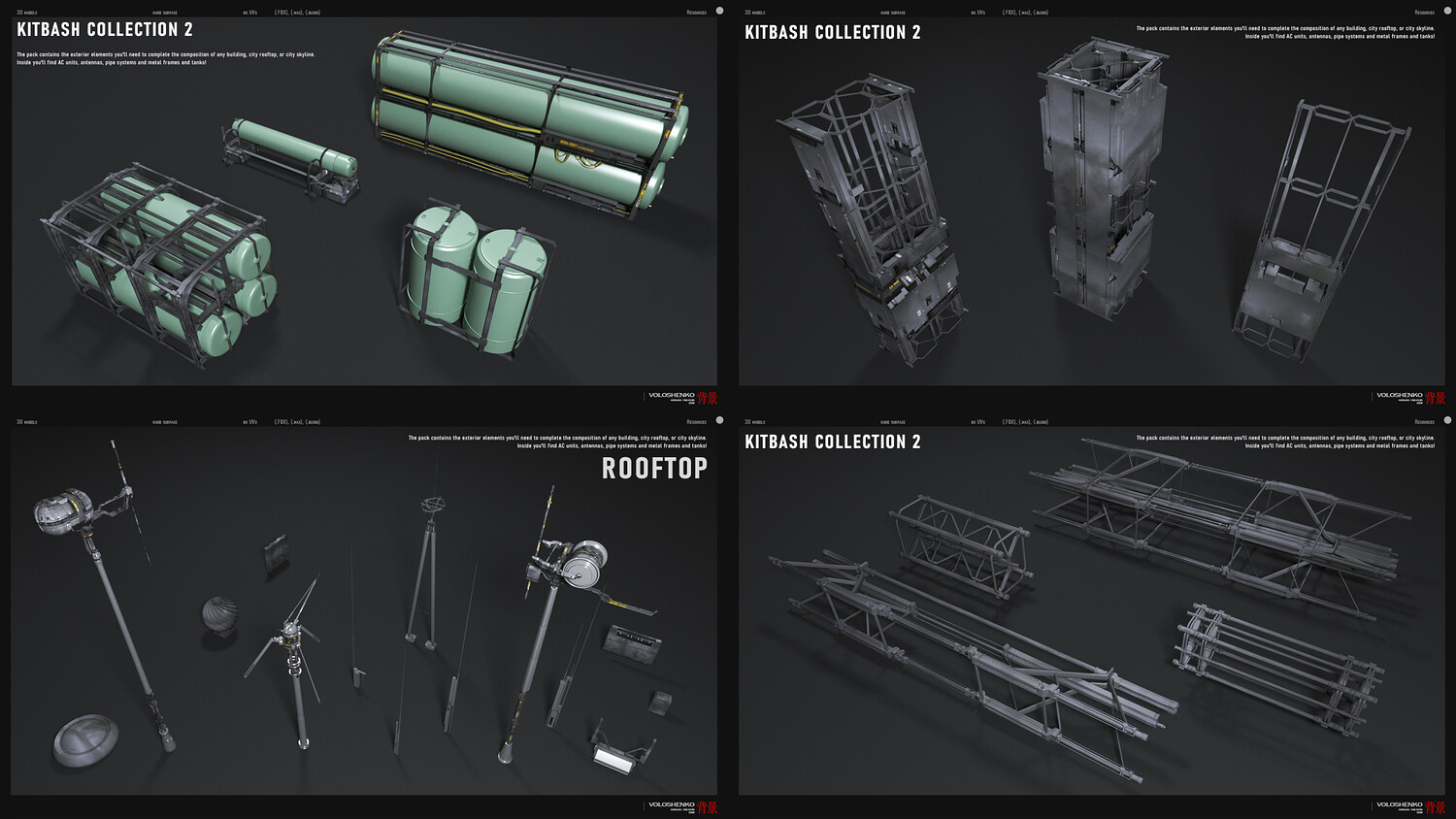 The pack contains the exterior elements you'll need to complete the composition of any building, city rooftop, or city skyline. Inside you'll find AC units, antennas, pipe systems and metal frames and tanks!