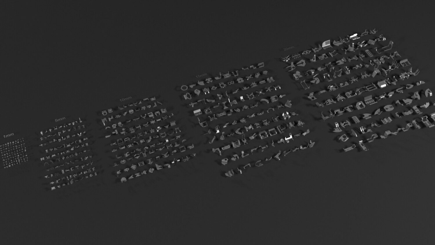 thickness 1 mm - 100 pieces - length 50 mm thickness 5 mm - 100 pieces - length 150 mm thickness 10 mm - 100 pieces - length 250 mm thickness 15 mm - 100 pieces - length 350 mm thickness 20 mm - 100 pieces - length 500 mm Diameter of round holes: 3 - 8 mm, + some have a nut and a double hole (one inside the other of different diameters).