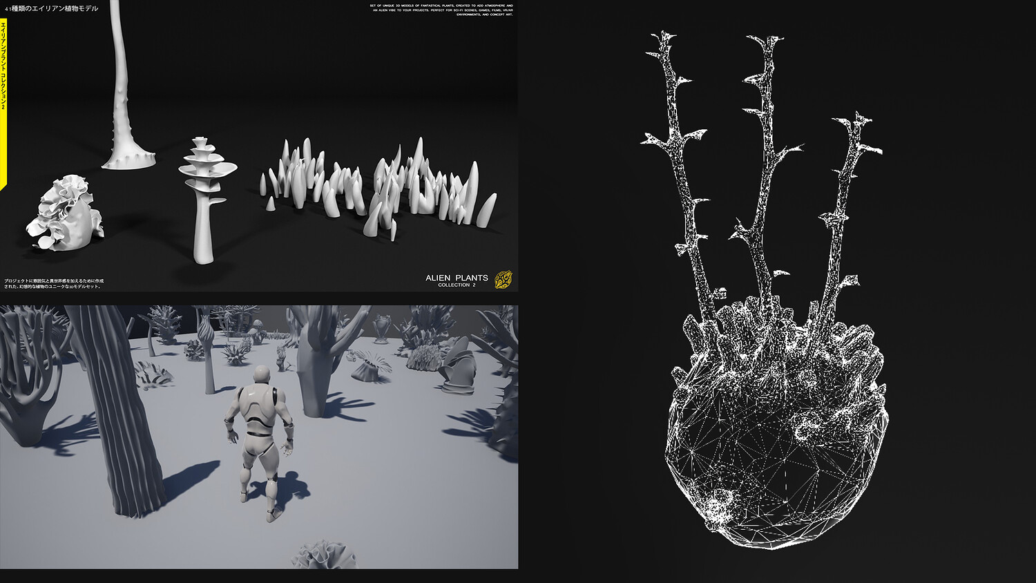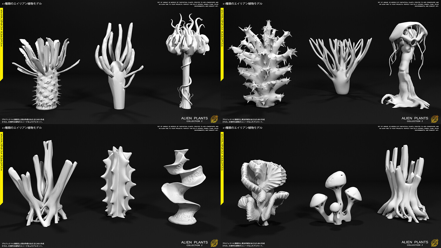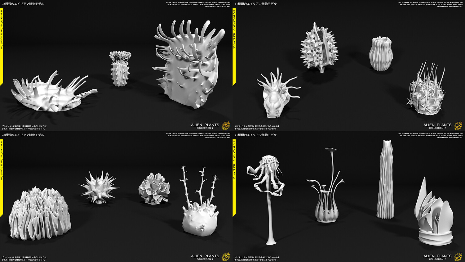 ALIEN PLANTS Collection (Vol. 2) ALIEN PLANTS Collection is a set of 41 unique 3D models of fantastical plants, specifically designed to add an immersive atmosphere and an otherworldly vibe to your projects. These models are a perfect fit for sci-fi scenes, game development, cinematic films, VR/AR environments, and concept art.