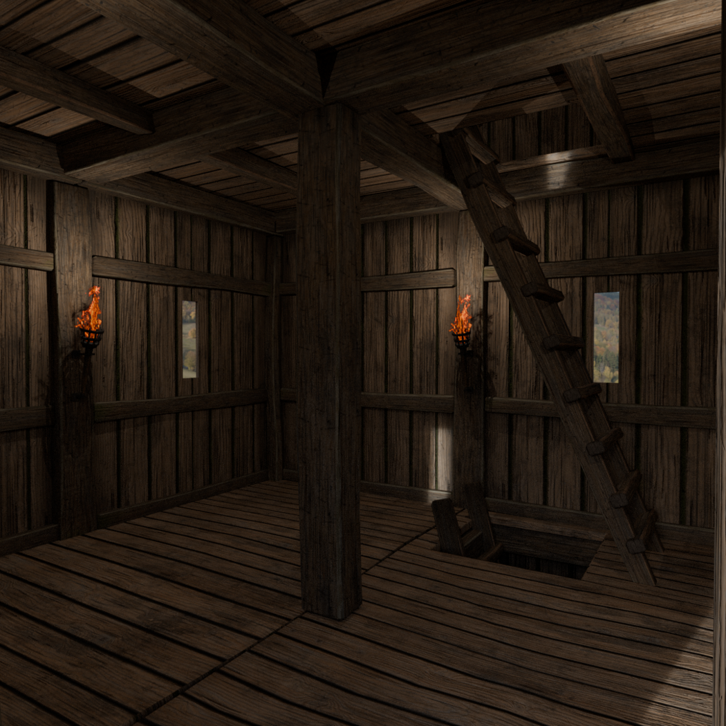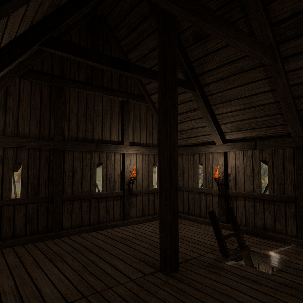 The interior is fully modeled and includes wooden floors, ladders, and structural elements, making the model suitable for close-up shots, cinematics, and gameplay use.