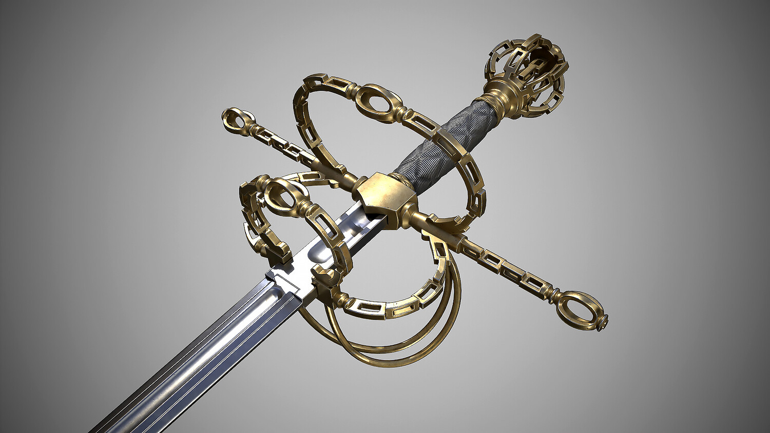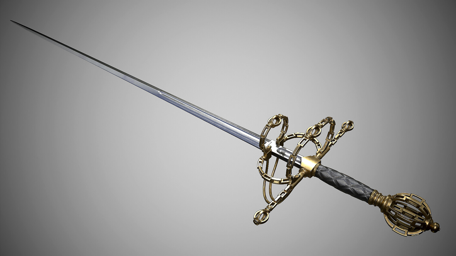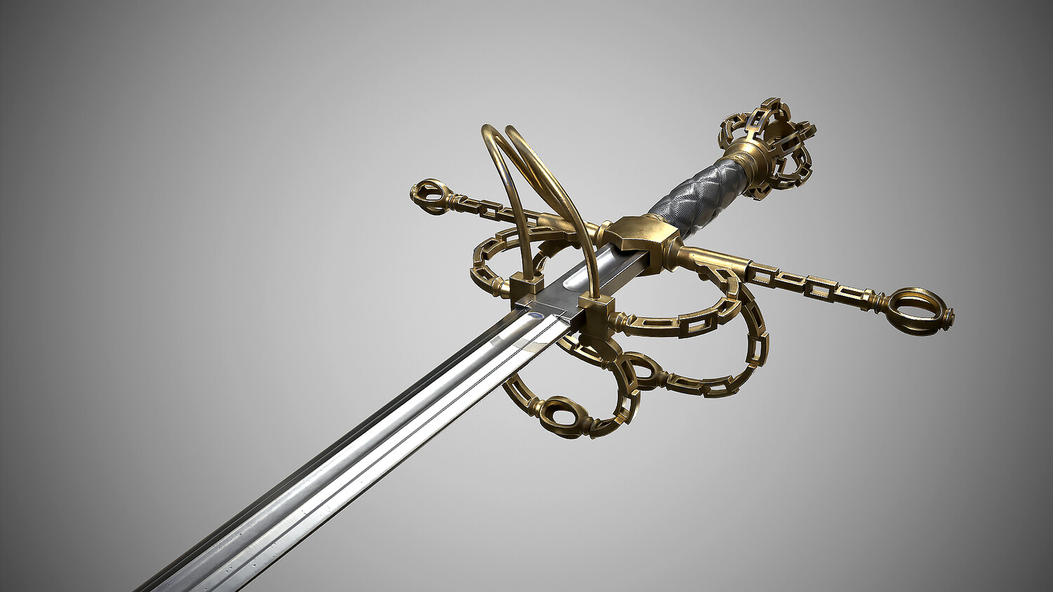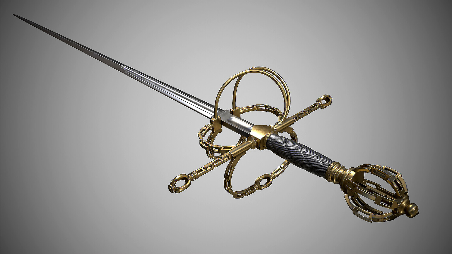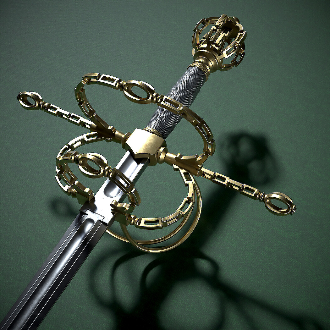 Rapier with fashionable “chain” hilt. Europe, dated first quarter of the 17th century. Total length 1310 mm. At the turn of the 16th-17th centuries, such hilts imitating chain links became fashionable for a short time. Low-poly pbr-game-ready model high poly modeling done in blender and ZBrush Low poly done in blender Textured in Substance painter, baked and rendered using Marmoset Toolbag 4 The Total polycount is -19k Tris Textures 4k PBR Metallic Roughness