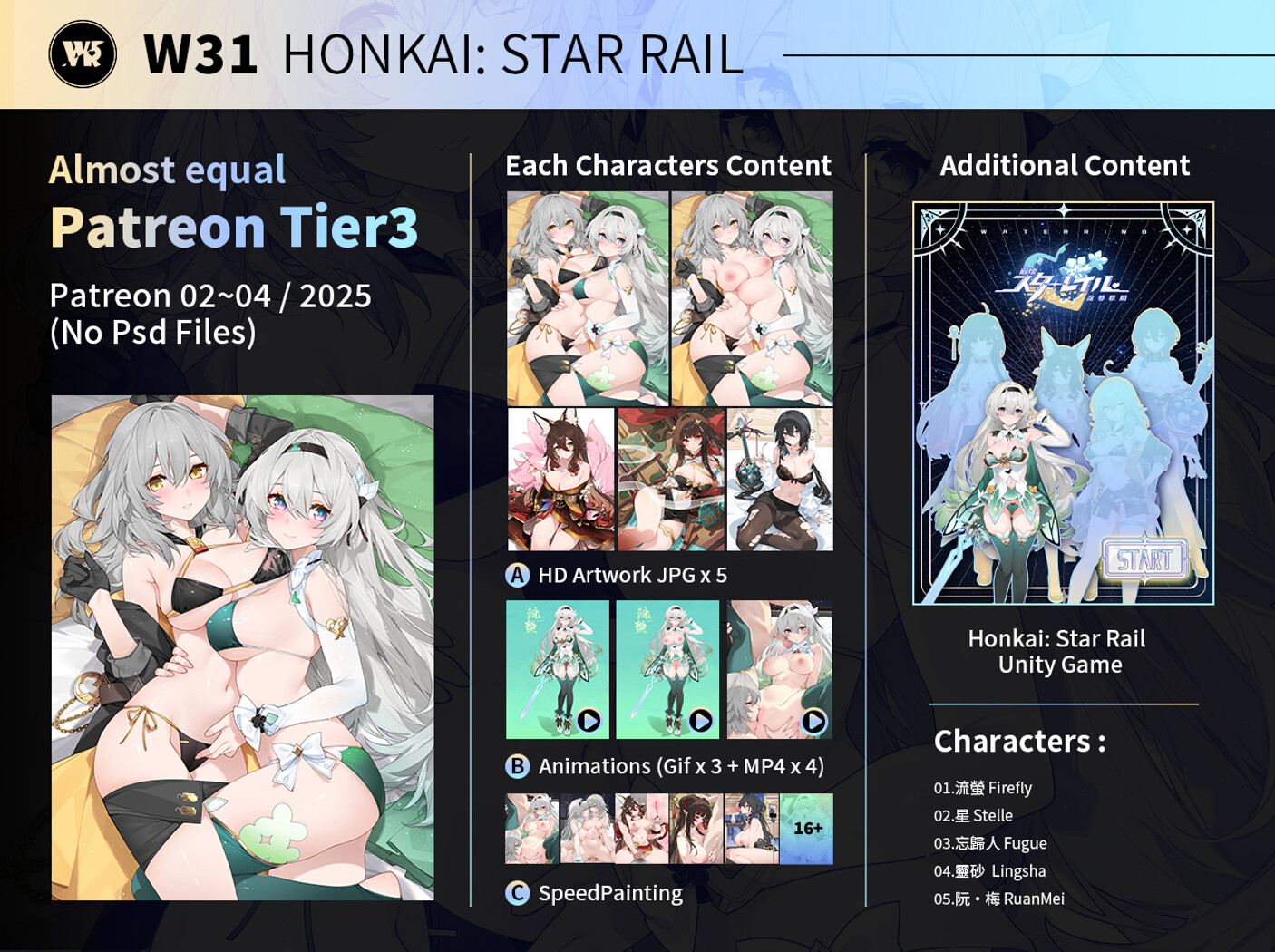 Each Characters Content : A.HD Artwork JPG x 6~7 B.Animations (Gif x 3 + MP4 x 4) C.SpeedPainting Additional Content : StarRail Reverie Tale Unity Game