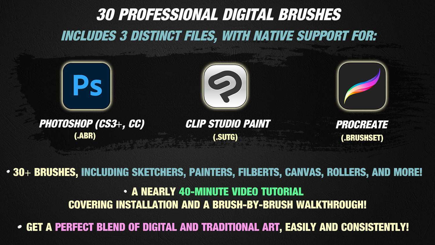 3 distinct brush files, for FULL NATIVE SUPPORT for Photoshop (.abr), CLIP Studio Paint (.sutg), and Procreate (.brushset) respectively!