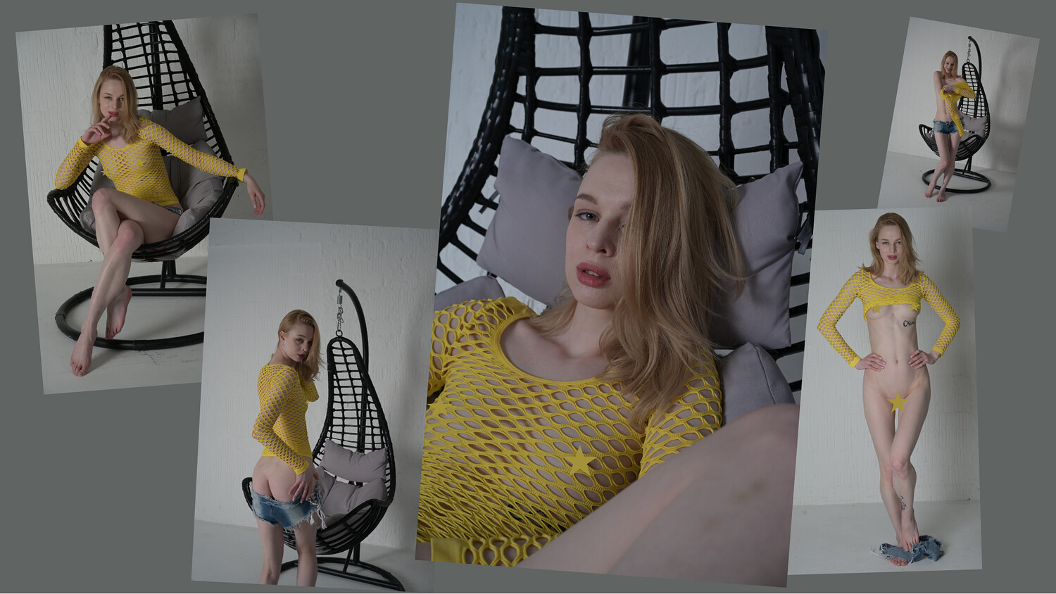 A very slim girl with blonde hair is wearing a jeans panty and a yellow net dress. She poses in front of a white wall and in a black hanging chair. 111 photos (.jpg) - all taken in high resolution. You can download 2.1 GB of data (zip).