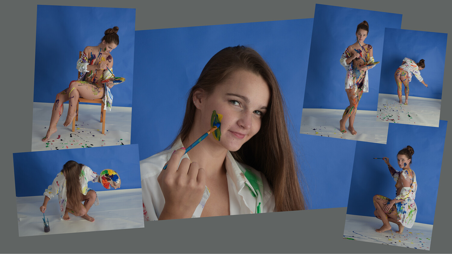 A beautiful german model in a painting session in the studio. The intention of this session was to have some base and high-resolution pictures for my own project. She's wearing a white blouse and starts with a palette and a brush. By the end of the session, there's a lot of colorful paint on her clothes and skin. 222 photos (.jpg) in high quality and high resolution. More than 5GB Data to download. The background is neutral blue for easy cutouts. And sure, no AI involved - just the model, me and my camera !