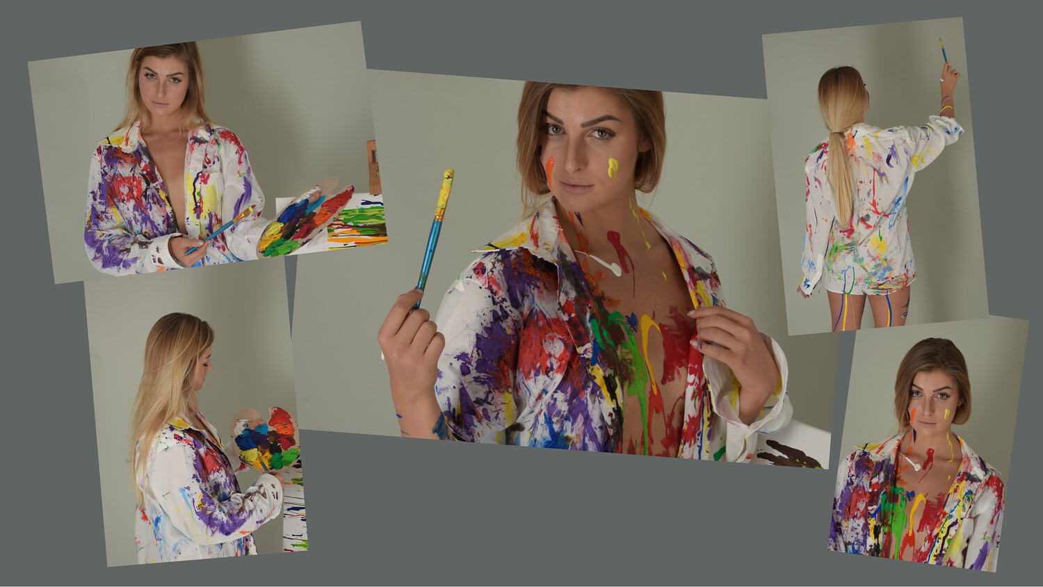 A beautiful model with long hair in another painting session in the studio. The intention of this session was to have some base and high-resolution pictures for my own projects. She's wearing a white blouse and starts with a palette and a brush, painting a picture. 129 photos (.jpg) in high quality and high resolution. More than 2GB Data to download. The background is neutral for easy cutouts. And sure, no AI involved - just the model, me and my camera !