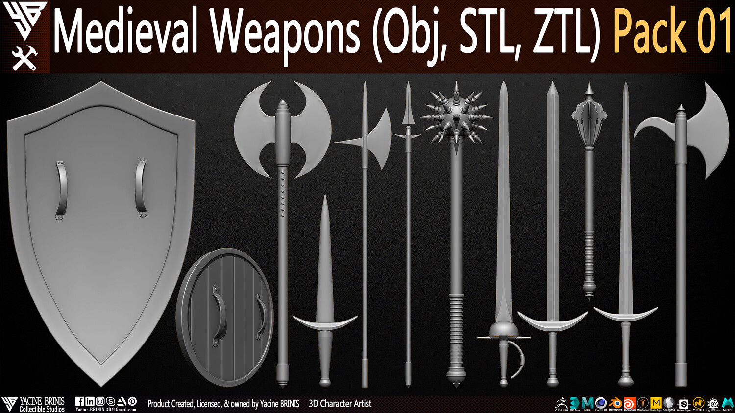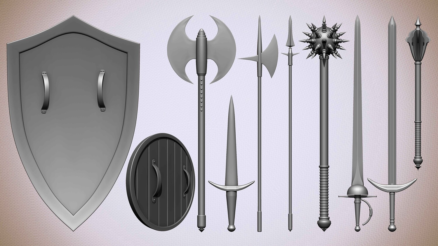 This pack offers a collection of meticulously designed medieval weapon models (Volume 01), featuring a variety of historically inspired arms perfect for enhancing your 3D projects. The pack includes a range of weapons such as swords, axes, maces, spears, and shields, all sculpted with intricate details to bring authenticity and realism to your work.