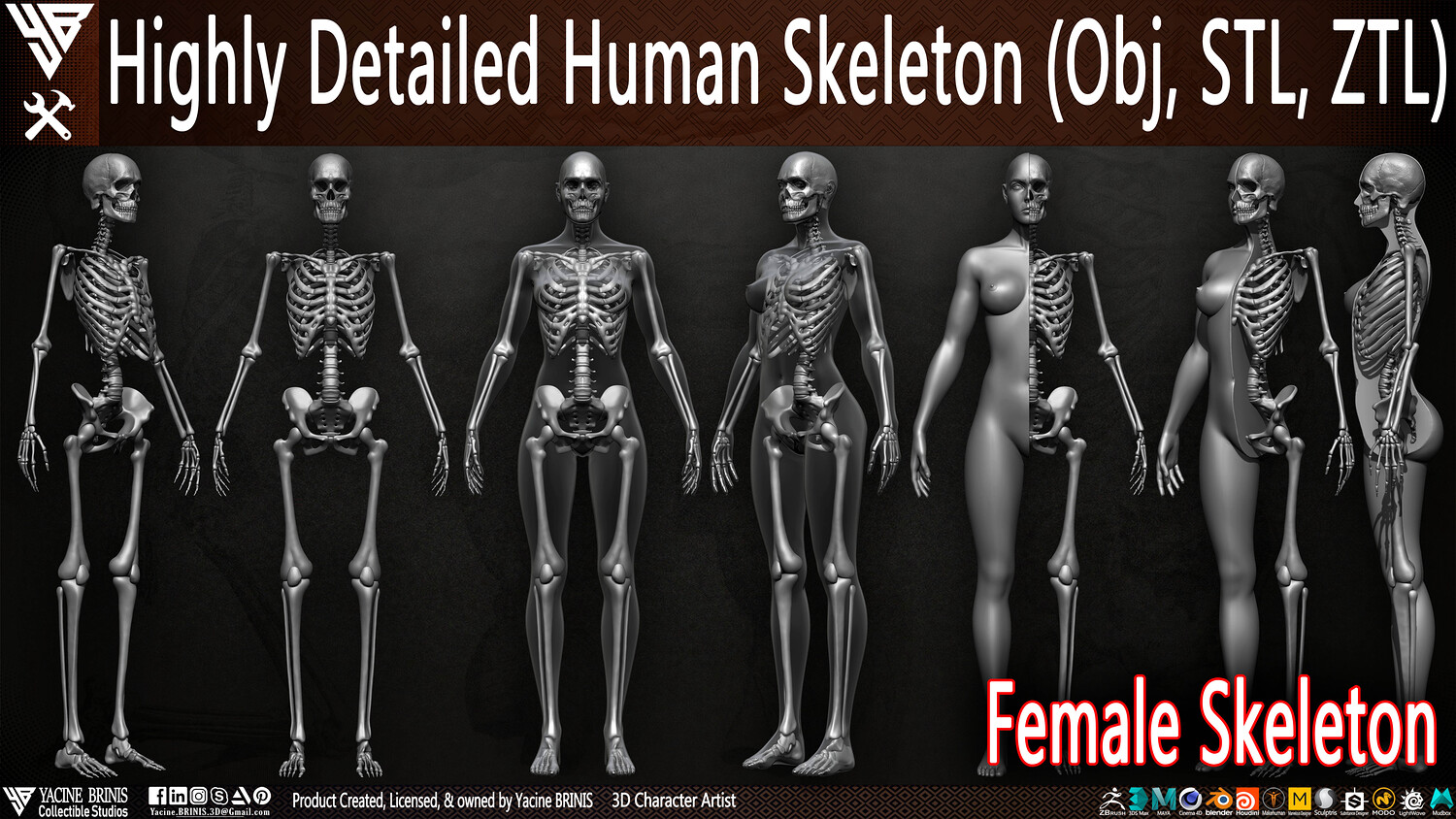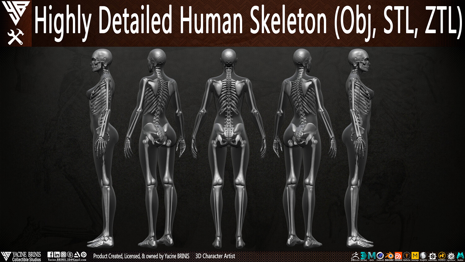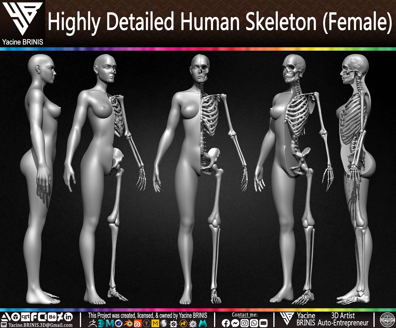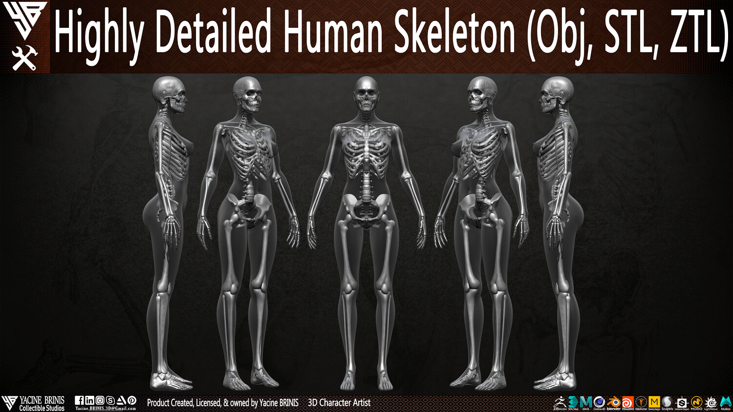 This Highly Detailed Human Skeleton (Female) model offers a scientifically accurate and finely crafted 3D representation of the female skeletal structure. Each bone is modeled with anatomical precision, providing a lifelike foundation ideal for character creation, medical visualization, educational tools, and anatomical studies.