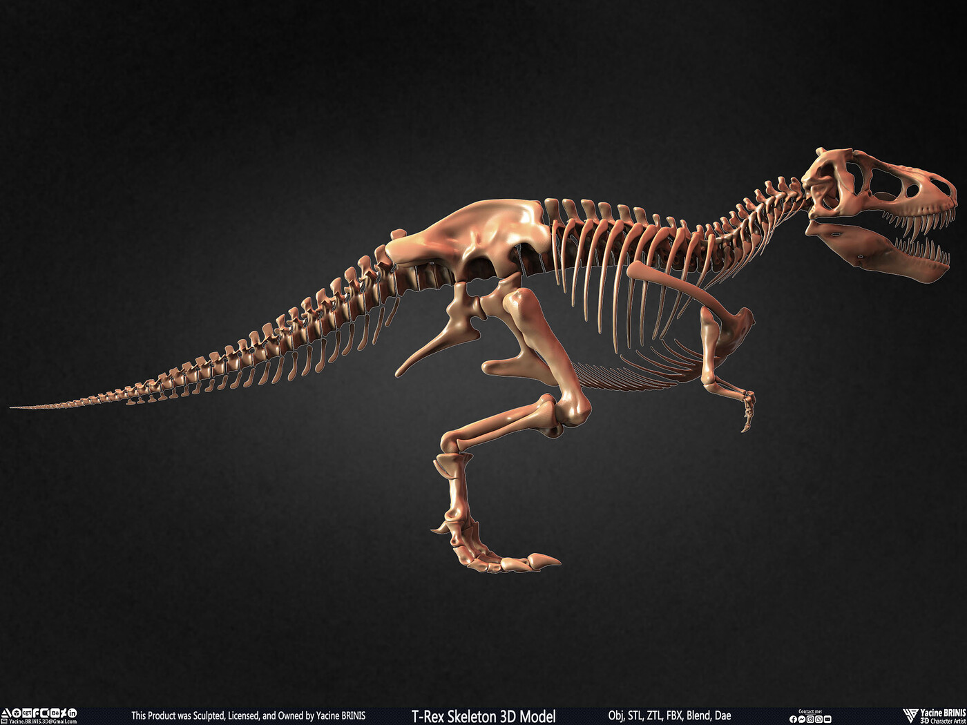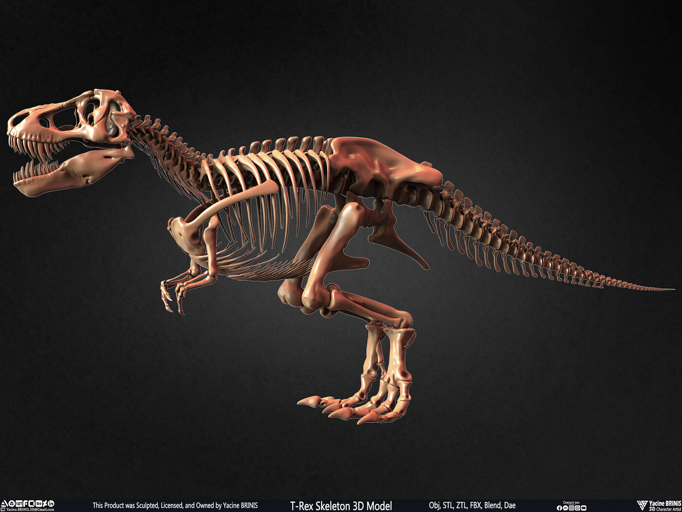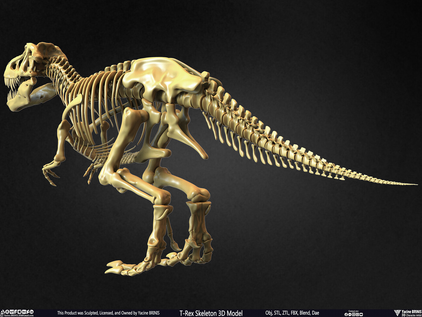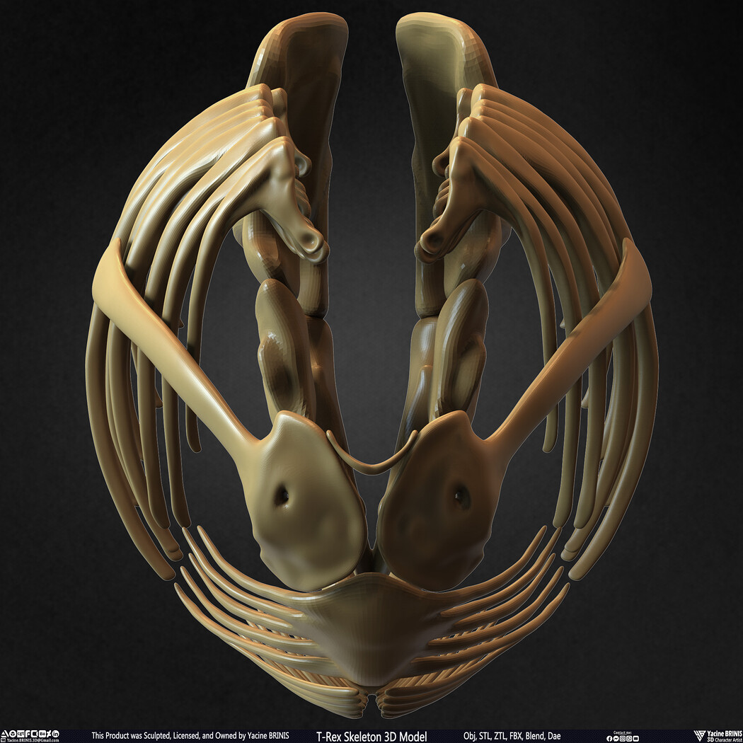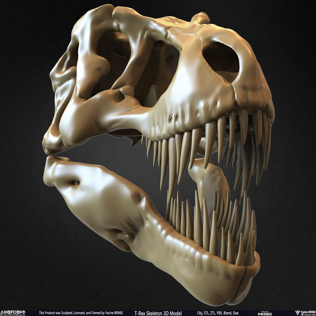 I am presenting a highly detailed T-Rex Skeleton 3D model, precisely sculpted to showcase the powerful anatomy of the iconic Tyrannosaurus Rex. This model is an excellent choice for realistic scenes, character design, film production, games, educational projects, and more, offering a versatile foundation for rigging and animation.