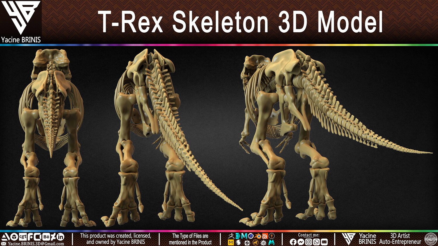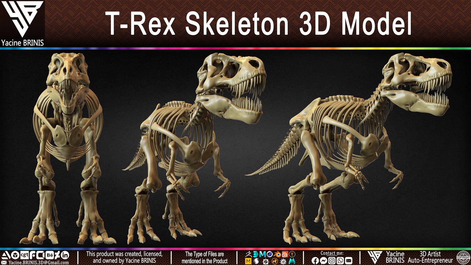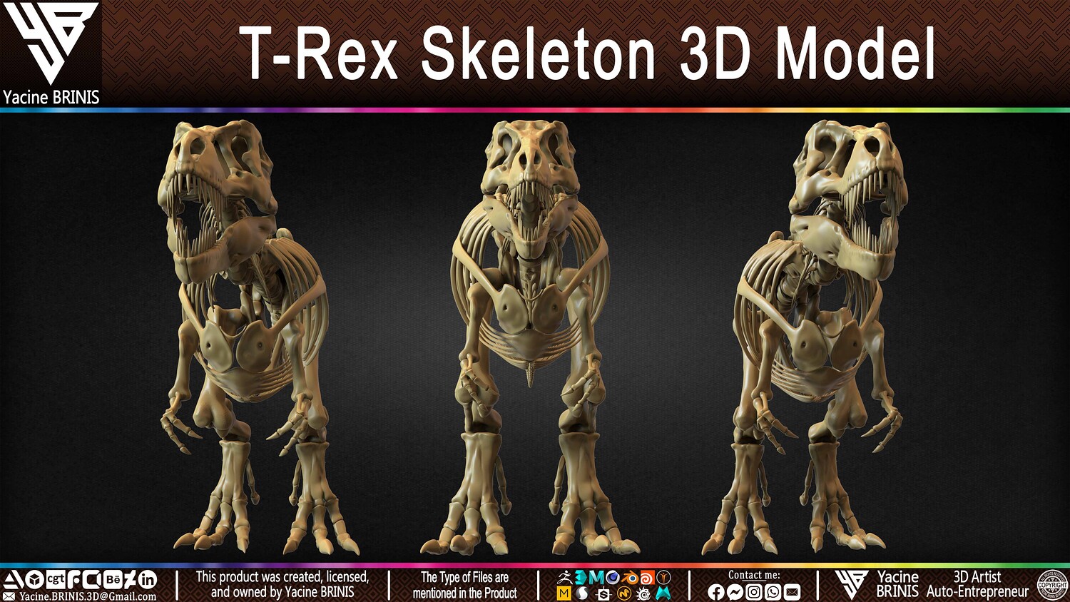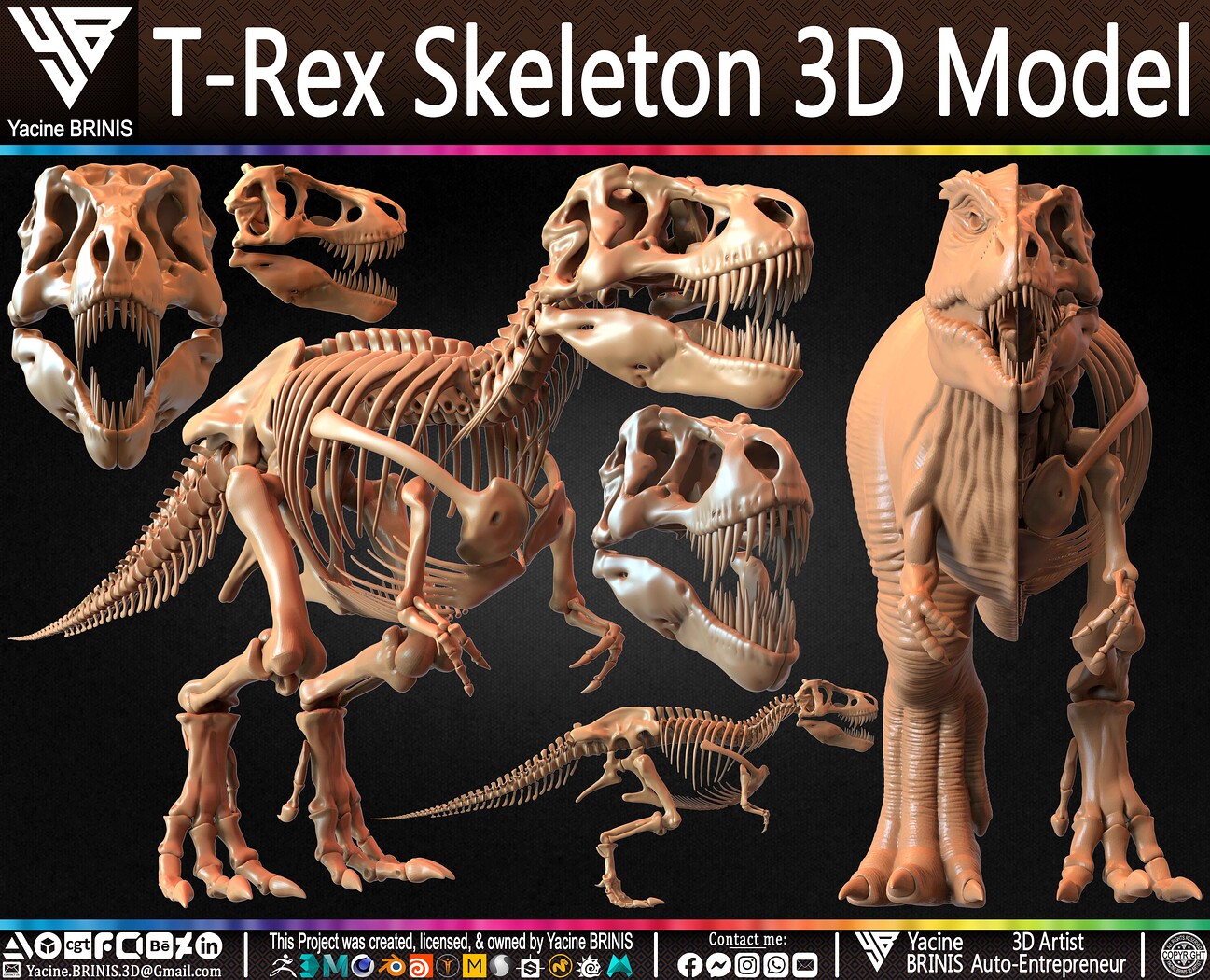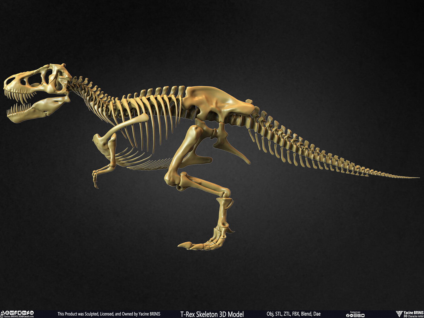 I am presenting a highly detailed T-Rex Skeleton 3D model, precisely sculpted to showcase the powerful anatomy of the iconic Tyrannosaurus Rex. This model is an excellent choice for realistic scenes, character design, film production, games, educational projects, and more, offering a versatile foundation for rigging and animation.