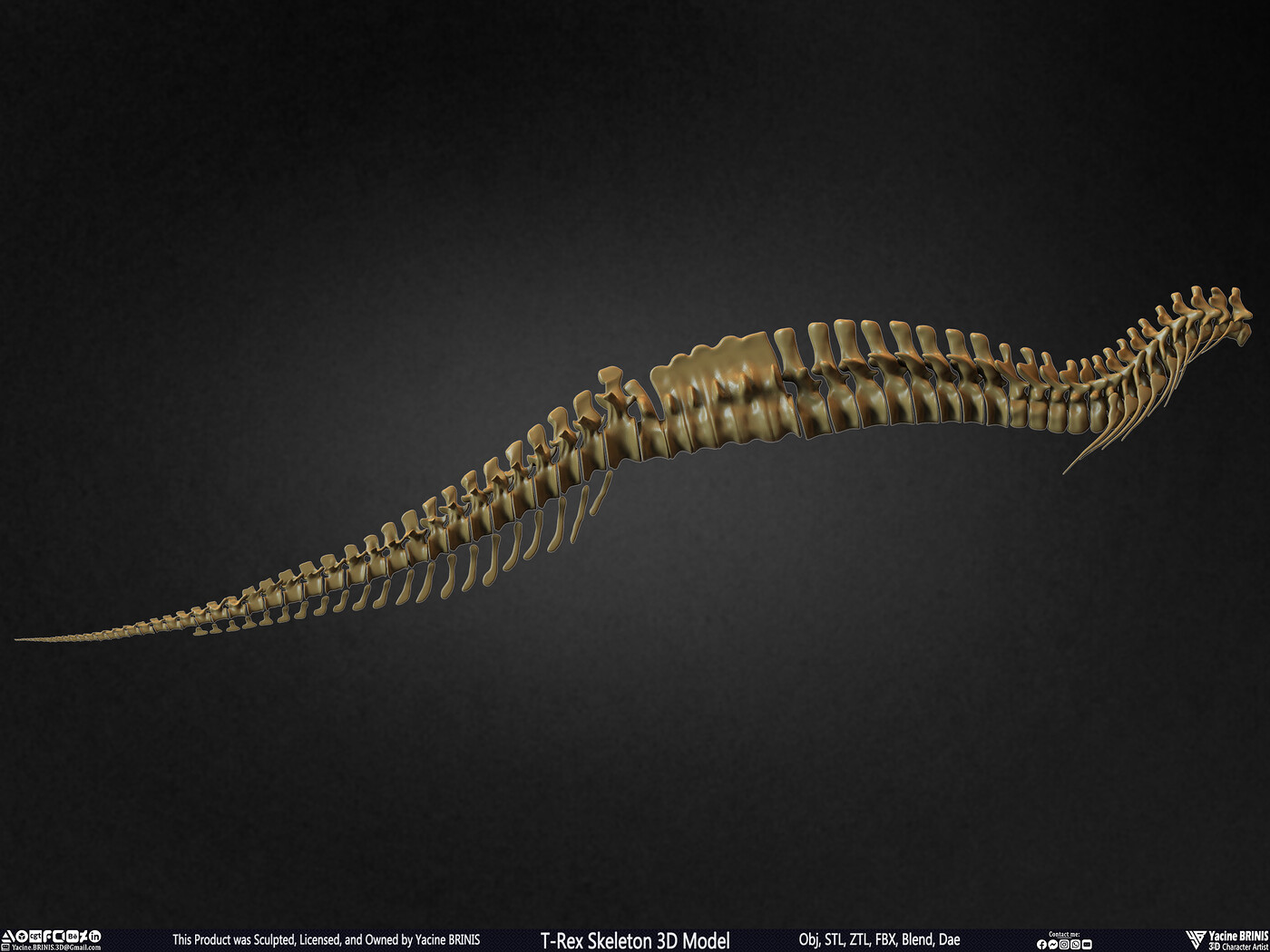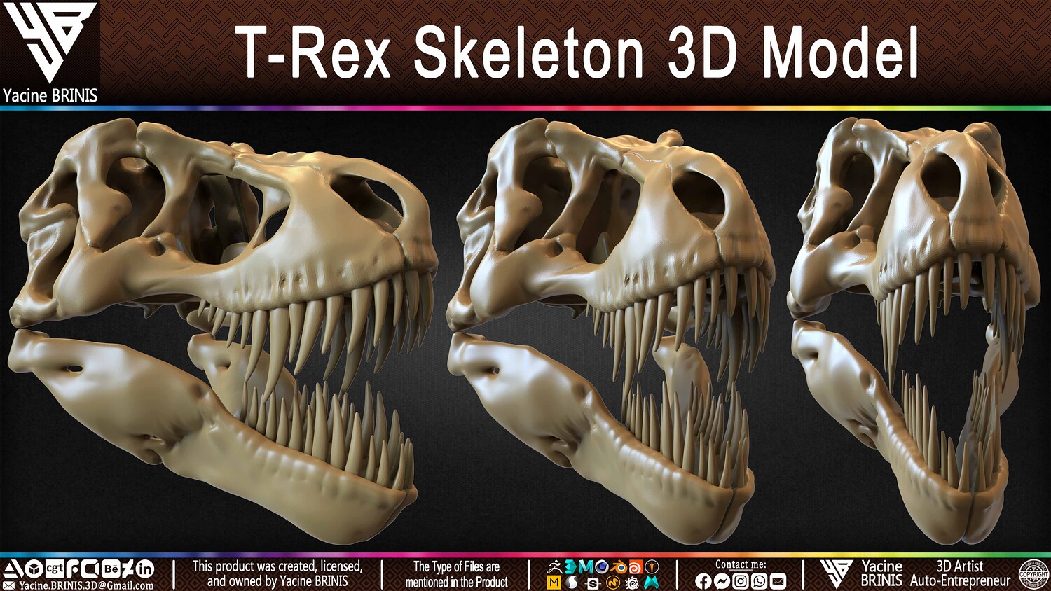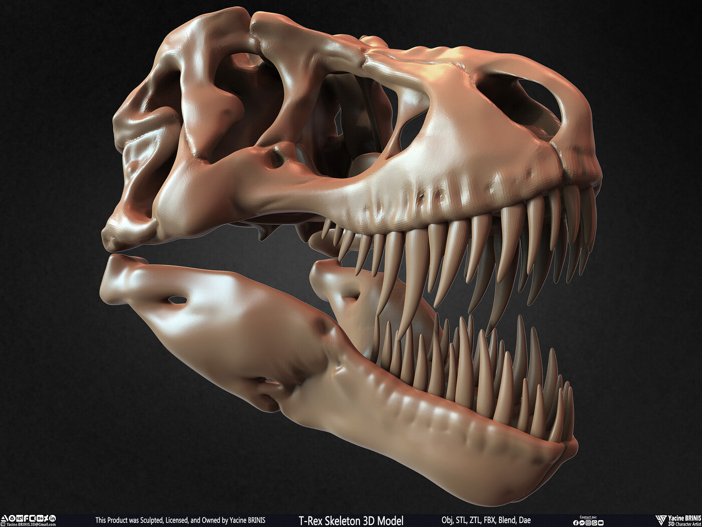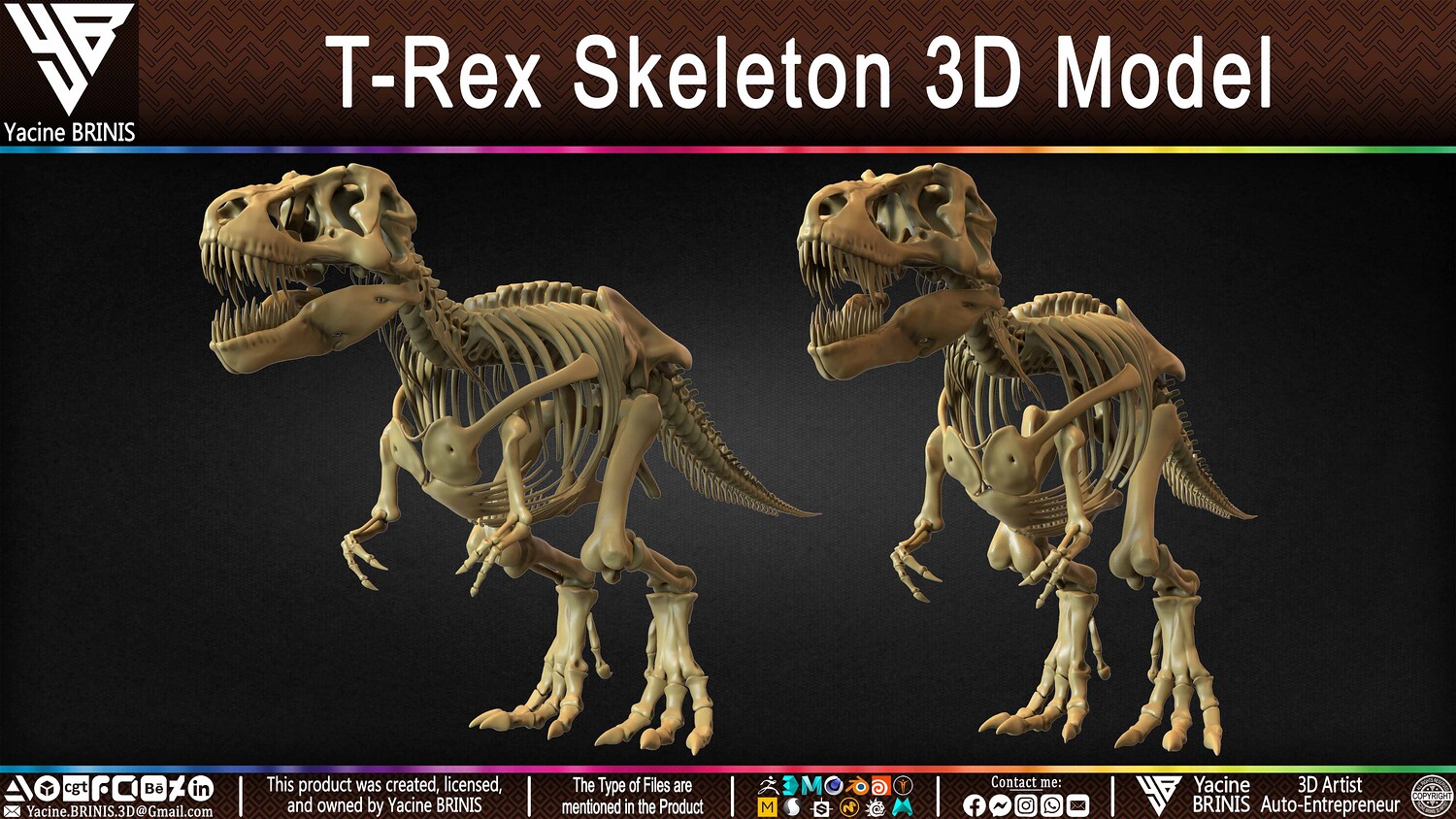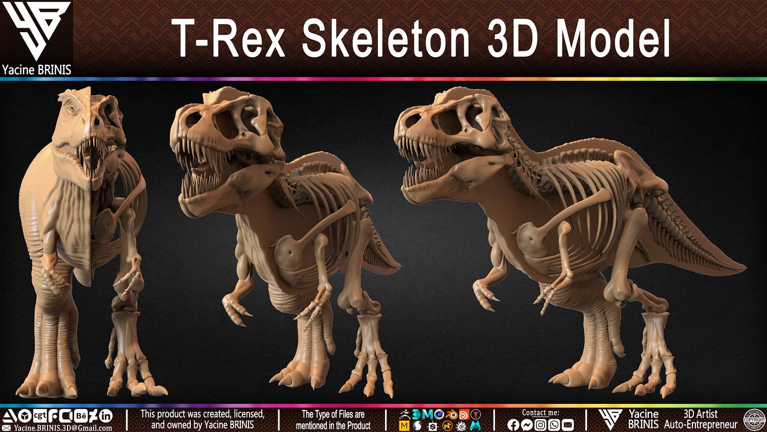I am presenting a highly detailed T-Rex Skeleton 3D model, precisely sculpted to showcase the powerful anatomy of the iconic Tyrannosaurus Rex. This model is an excellent choice for realistic scenes, character design, film production, games, educational projects, and more, offering a versatile foundation for rigging and animation.