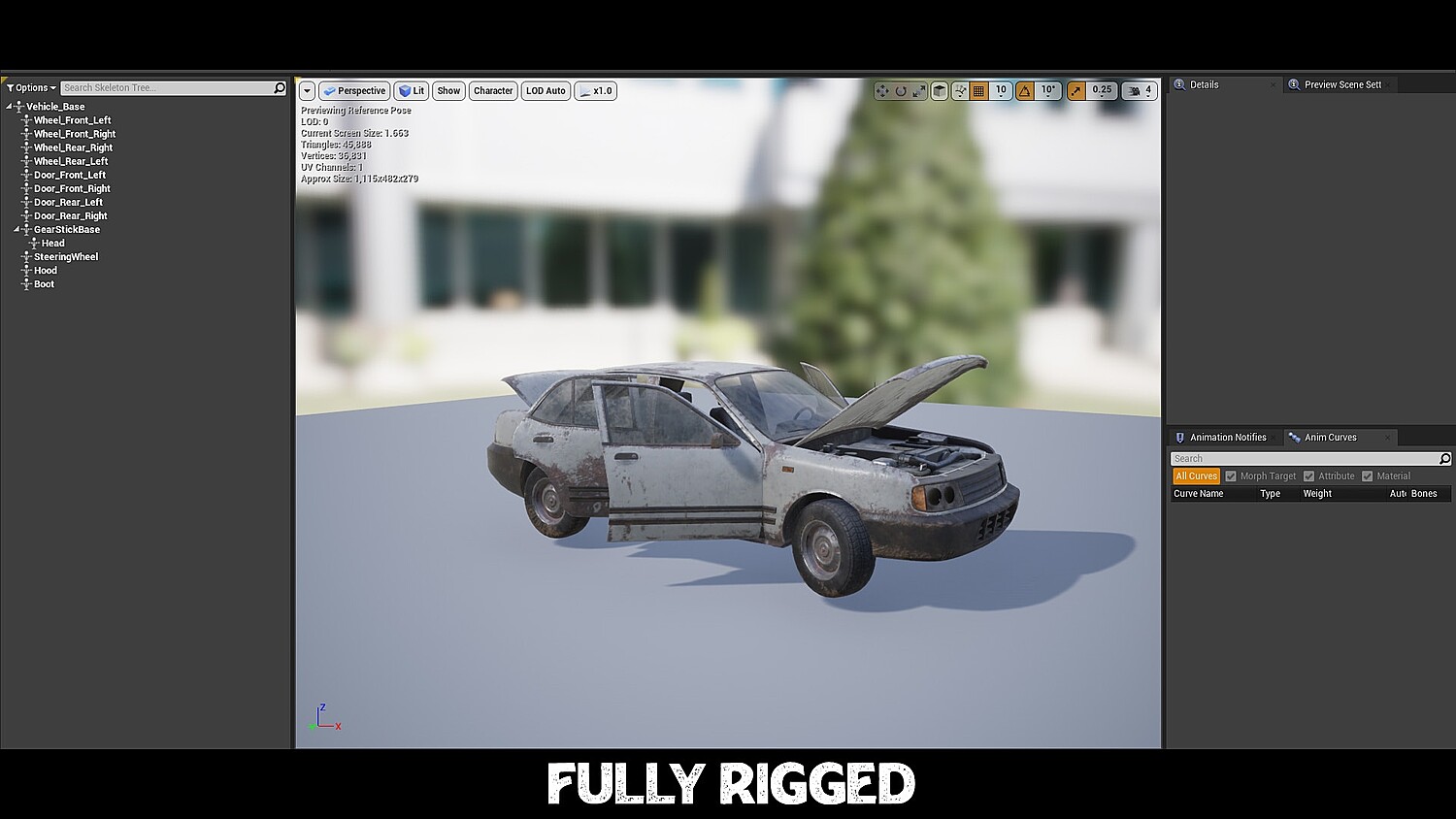 A fully rigged Skeletal Mesh version of the vehicle is included. It has a custom skeleton and includes bones for: